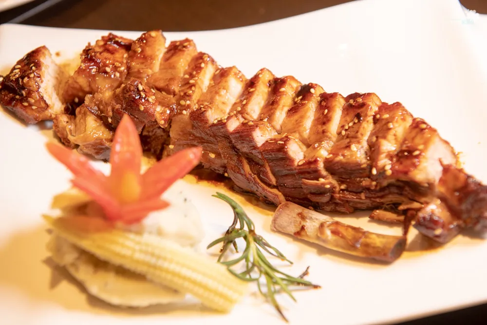 基底豬肋排以偏西式的作法料理,佐用中式的醬汁醃漬,那誘人的色澤與香氣濃郁的醬汁令人食指大動,入口即化的鮮甜富含多層次的美味,讓人忍不住吮指回味。