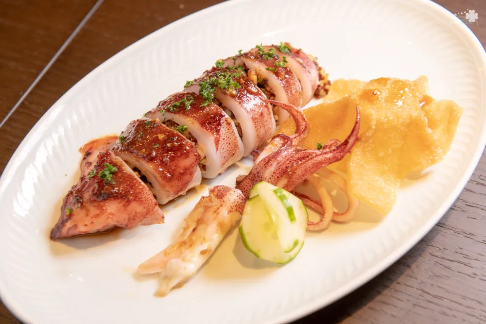 使用澎湖空運過來的小管,在裡面放入小米、藜麥、洋菇、香菜末等下去做烤的動作,每個食材都保留了質樸的鮮美,而這道菜會被稱為海賊王,是因為主廚將餃子皮炸成像魯夫的草帽一樣,算是相當俏皮的一道創意料理。