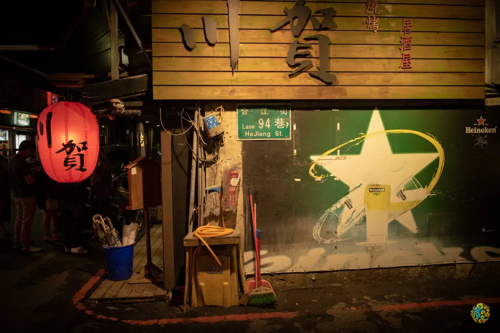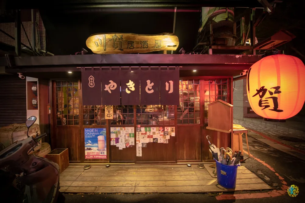 合江街內一棟日式小屋,門邊溜置了日式酒桶,暖黃的燈光自玻璃間灑落街角,玻璃窗上人影幢幢,隱約能聽見裡面開心歡愉的笑聲,玻璃酒杯在燈光下閃閃發光,吧台小桌人群圍坐,一個能讓人放鬆的好地方,這就是川賀燒烤居酒屋。