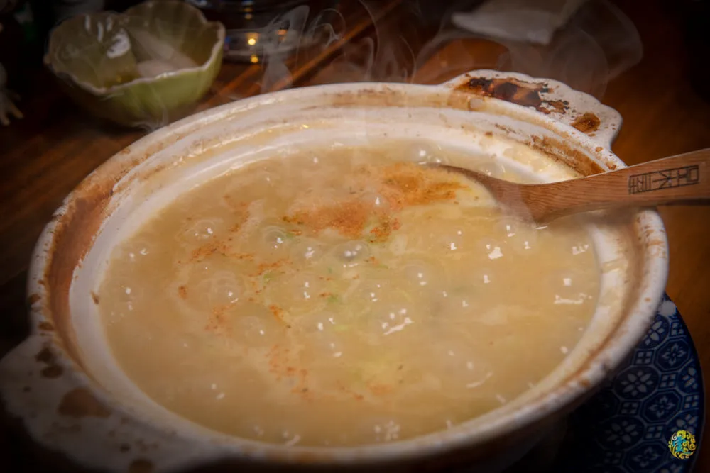品嚐完蟹肉之後,店家會把整碗端走,再加入生米慢煮至熟,就成了一碗日式雜炊粥。米飯吸飽了海鮮的精華,蟹膏與奶油融合的氣息盈滿鼻尖,在嘴裡綻放極盡奢華的滋味。