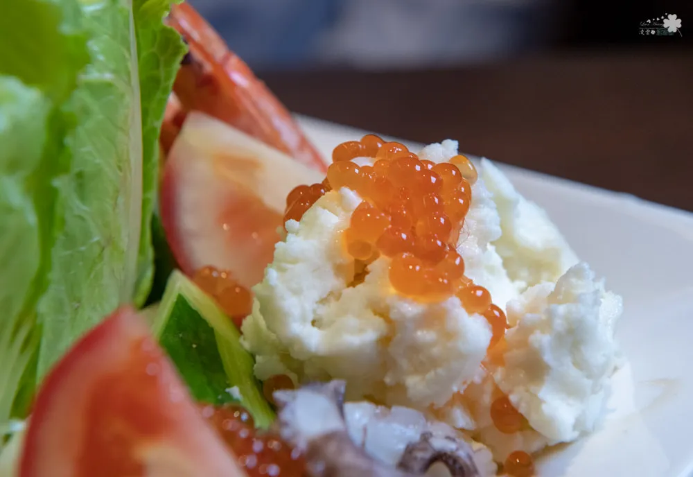 豪邁的將鮭魚卵散佈在沙拉的各角落,令人眼睛為之一亮。 吃進嘴裡,不僅有爆漿的感覺,更有著濃濃的海味,帶點醃漬過後的鹹味以及黏稠的口感,讓味覺整個鮮活起來。