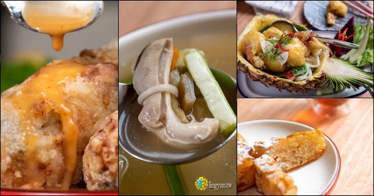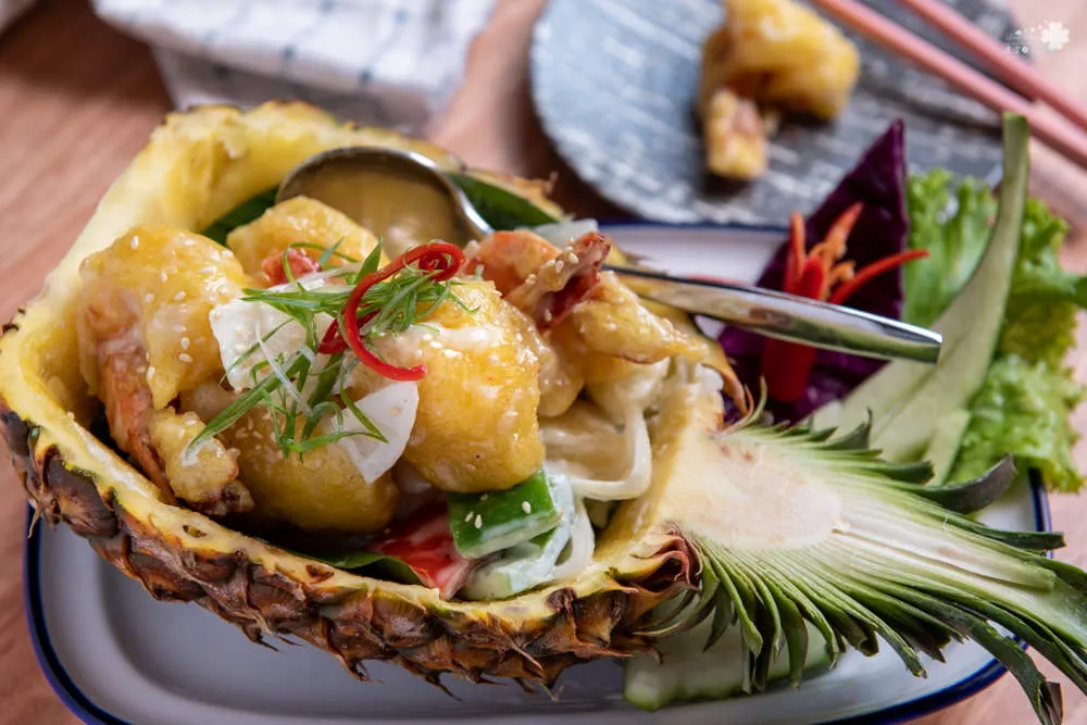 以剖半的鳳梨盛裝的鳳梨鮮蝦球,彈牙的鮮蝦與鳳梨極為合搭,酸甜的滋味席捲味蕾,酥脆的外殼包裹著鮮甜的肉質,香、脆、鮮三重風味讓人只想一口接一口。
