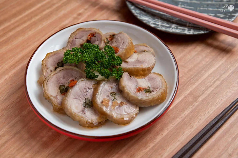 混合豬絞肉與洋蔥做成內餡,在加入中式香料後,包裹在豬網紗中配上豬肋骨,就成了宜蘭相當知名的龍鳳腿。酥脆的表皮與內餡完美結合,不只能吃到完整的肉塊,清脆可口又多汁的荸薺,讓口感更為扎實也減輕了油膩感,淋上豆味濃郁的紅味噌醬,更添風味。