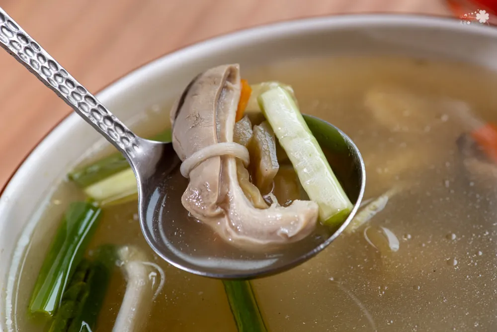這是道手工繁瑣的湯品,將酸菜、豬肚、紅蘿蔔、香菇、胡瓜乾等切片後,用蒲仔乾綁成束固定,嫩脆、韌性與厚實的口感一次滿足,饒富咀嚼樂趣,酸爽鹹香的湯頭襲捲味蕾,療癒又暖胃。