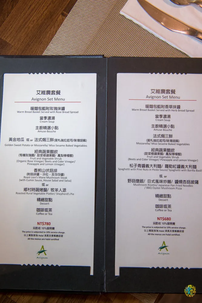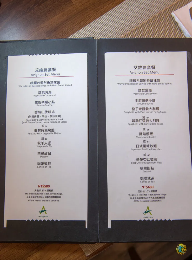 艾維農的菜單,主要有四大套餐、商業午餐、飲品與單點菜單,另收一成服務費。飲料也能以補差價的方式進行更換。艾維農使用台灣當地當季的新鮮食材,現點現做,除了提供客戶最優質的美食品質之外,也間接支持當地農業生產的經濟發展。