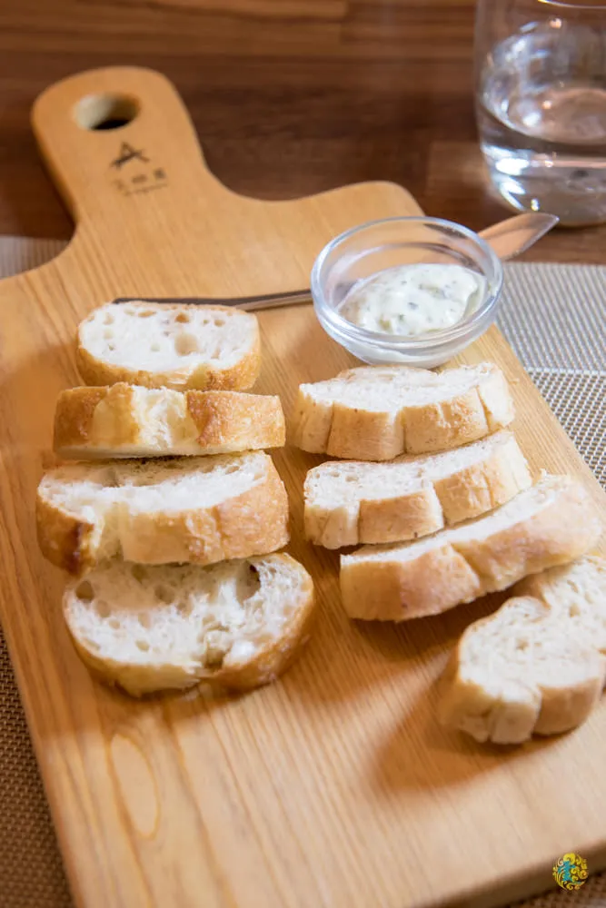 鬆軟的法式麵包搭配店家自製的香草抹醬,滑順可口。採用全植物奶油,加上使用台灣在地小農自栽的香草製成的香草抹醬,替美味加分不少。