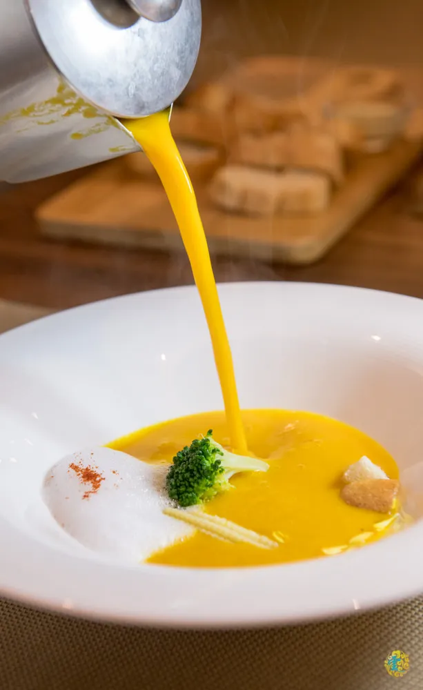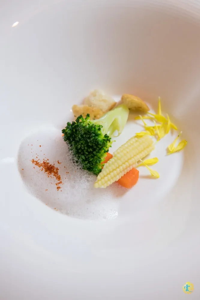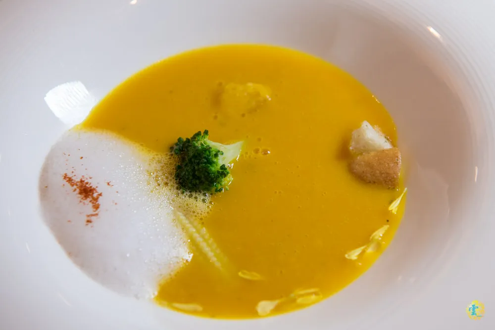 白色泡沫是大豆卵磷脂與檸檬打發而成,上頭撒點紅色甜椒粉,加上花椰菜、紅蘿菠、玉米筍與麵包塊,最後淋上濃醇的南瓜濃湯,喝起來鮮甜又療癒。