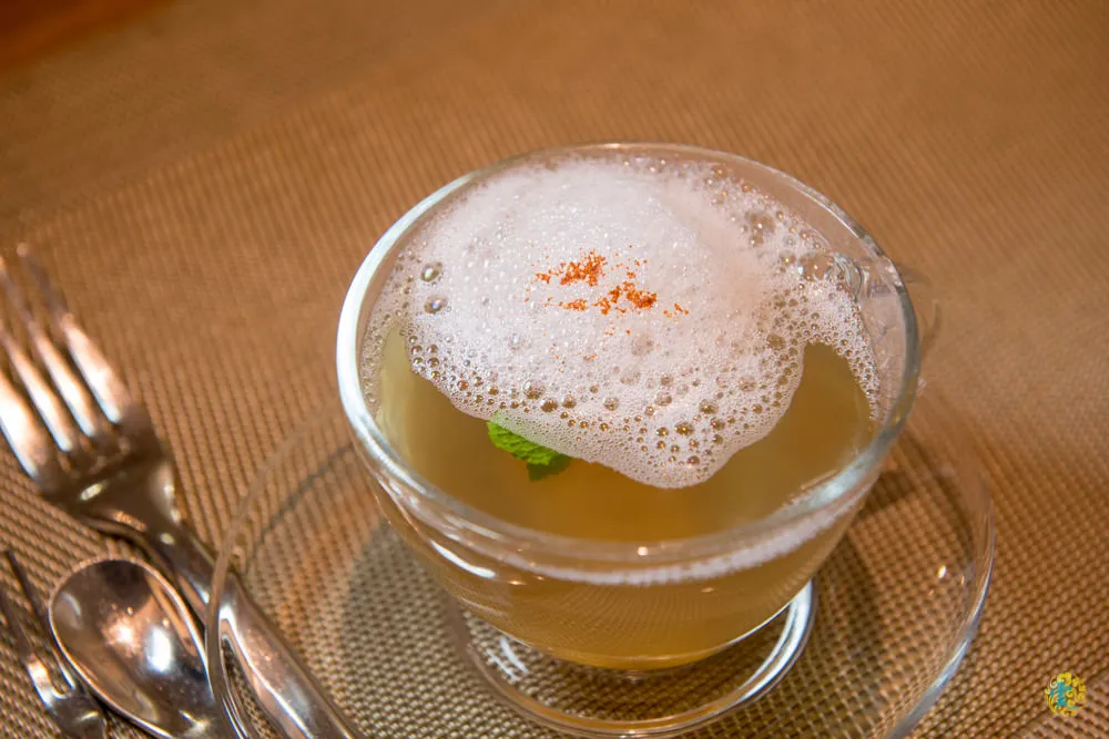 一樣有大豆卵磷脂檸檬泡,加上蕃茄、薄荷葉與甜椒粉。倒入由高麗菜、迷迭香與百里香調味而成的湯品,喝起來鮮甜又清爽。