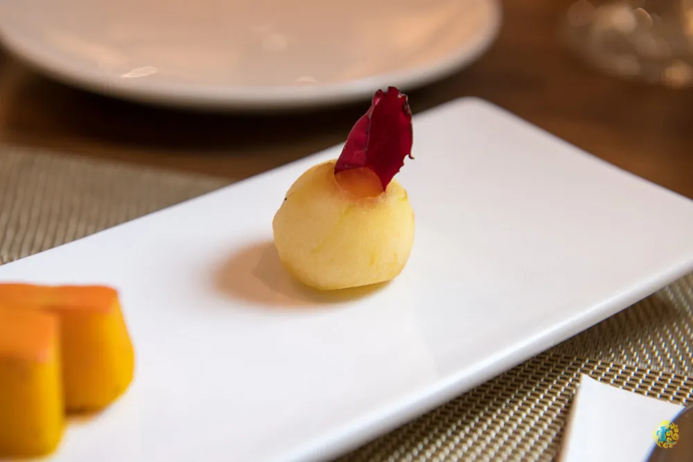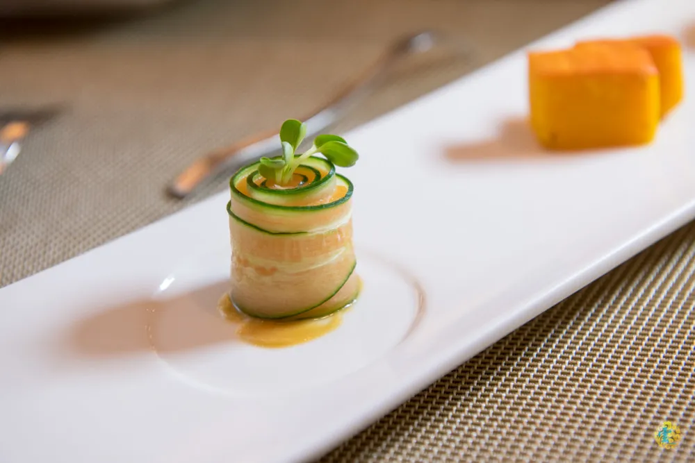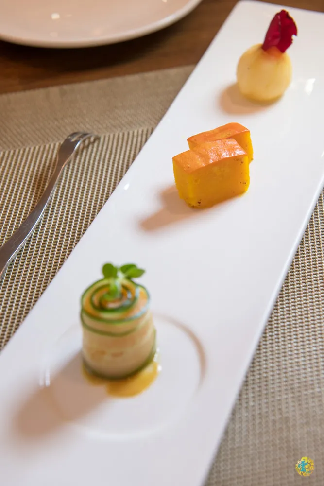 主廚精心設計的精緻開胃小點,每一道都令人意猶未盡。清脆鮮甜的蘋果,鬆軟香甜的南瓜,清爽脆口的小黃瓜鮮蔬捲,每個都營養美味。
