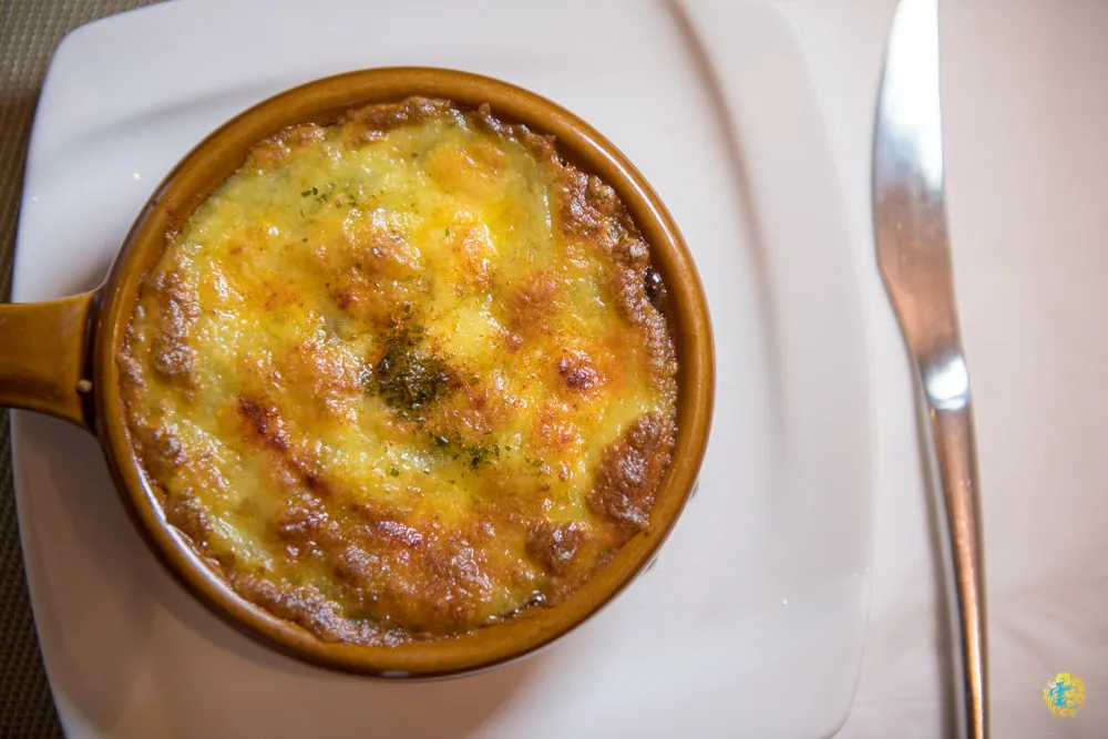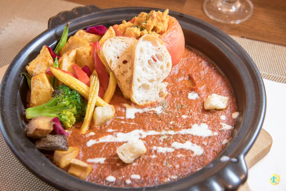 以特製的蕃茄醬為基底,鋪上法式麵包、玉米筍、地瓜、花椰菜、紅椒、香菇與富含內餡的整顆蕃茄,構成一幅鮮艷的美食地圖。法國麵包扎實的口感,提昇了口味的清香度,酸甜不膩的蕃茄醬,豐富了味覺的深度,各種蔬食配料豐富了整體的味道層次,多樣的鮮味層層釋出,令人回味無窮。