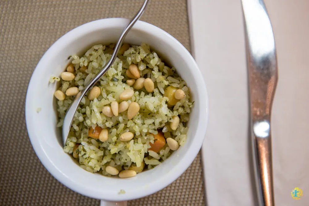 鄉村時蔬烤盤附的米飯,以泰國米為主軸,搭配青醬、松子、白果與蘿勒,咀嚼之間齒頰留香,這道餐點就算直接升級變成主餐,相信也是不少人買單。