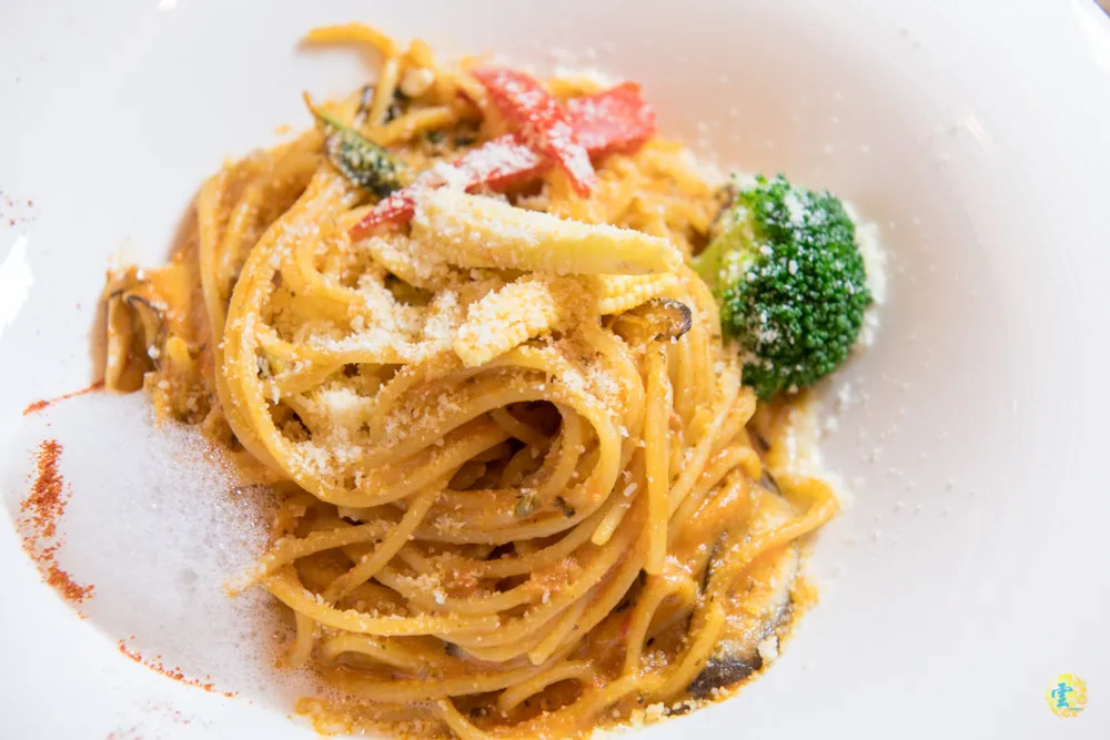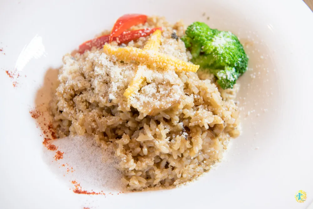 口感香Q滑軟的燉飯,咀嚼後有清爽的甜味,自然回甘。香滑清脆的野菇香氣提昇了燉飯的美味。綿密的燉飯配上軟嫩培根,色香味俱全。