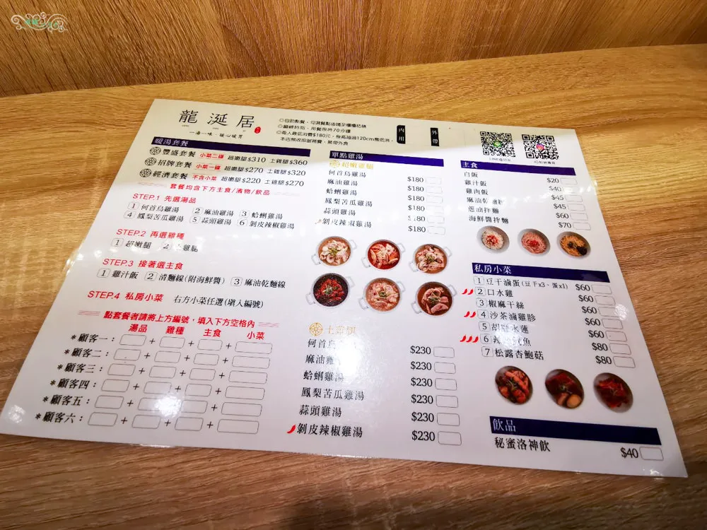 在龍涎居好湯可以選擇套餐型式,自行組合店內所有餐點,如果沒打算吃這麼多,也可以單點自己喜歡的品項。凌雲與女王都選擇套餐,套餐共有三種選項:豐盛套餐(小菜二碟)、招牌套餐(小菜一碟)、經濟套餐(不含小菜),同一種套餐還區分超嫩腿和土雞腿,分別是體型稍大,肉質介於軟嫩白肉雞與結實黑羽肉雞之間的紅羽山雞,以及體型稍小,肉質結實有嚼勁的黑羽土雞。首先先選擇套餐種類,接著湯品六選一(何首烏雞湯、麻油雞湯、蛤蜊雞湯、鳳梨苦瓜雞湯、蒜頭雞湯與剝皮辣椒雞湯),在選雞品(超嫩雞腿或是土雞腿),接著選擇主食三選一(雞汁飯,附海鮮醬的清麵線與麻油乾麵線),最後小菜七選一(豆干滷蛋、口水雞、椒麻干絲、沙茶滷雞胗、胡麻水蓮、辣椒魷魚與松露杏鮑菇)。