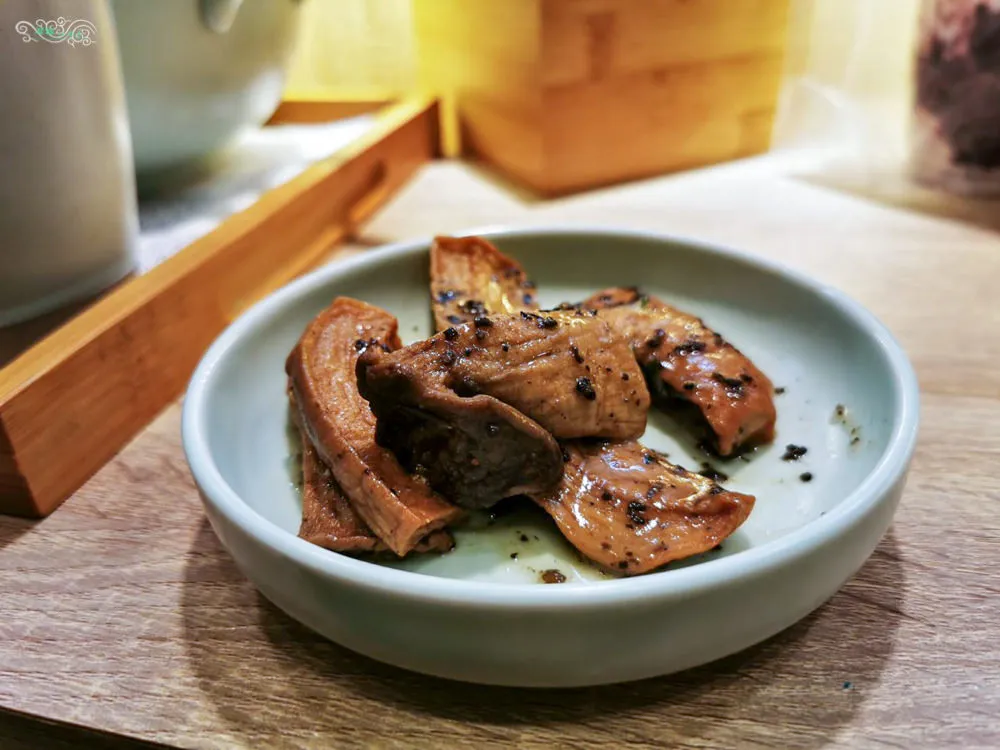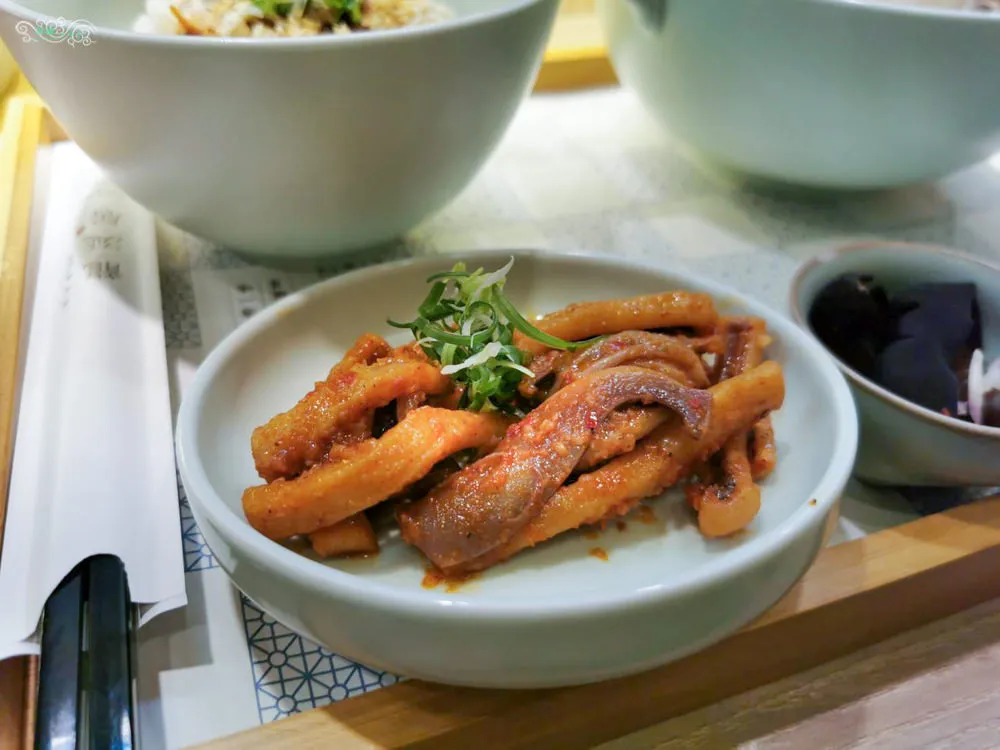 龍涎居的雞肉都切得相當工整,厚薄也都差不多,細嫩好入口,搭配紅棗、熟地與枸杞等多種中藥材精心細火慢燉的何首烏雞湯,喝一口甘醇濃郁,不燥又暖身。鋪上雞肉絲在淋上雞汁的雞汁飯,肉質Q嫩口感好,嘴裡的鹹甜滋味配上何首烏雞湯,真的暖心又暖胃。店員推薦的辣辣魷魚,冰涼Q脆又帶點些微的辣度,在整體配餐中為舌尖帶來不一樣的味覺感受。套餐附的秘密洛神飲,是店家自行熬製的,輕巧的甜止渴又養生。