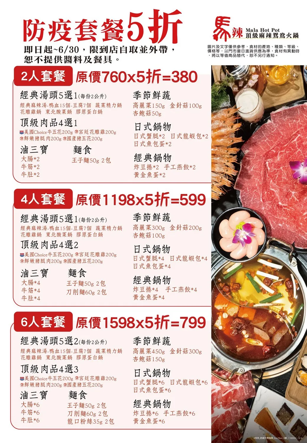 讓你安心防疫,馬辣推出到店自取外帶$380起的5折防疫套餐,肉肉加量不加價,要記得先電話預訂。