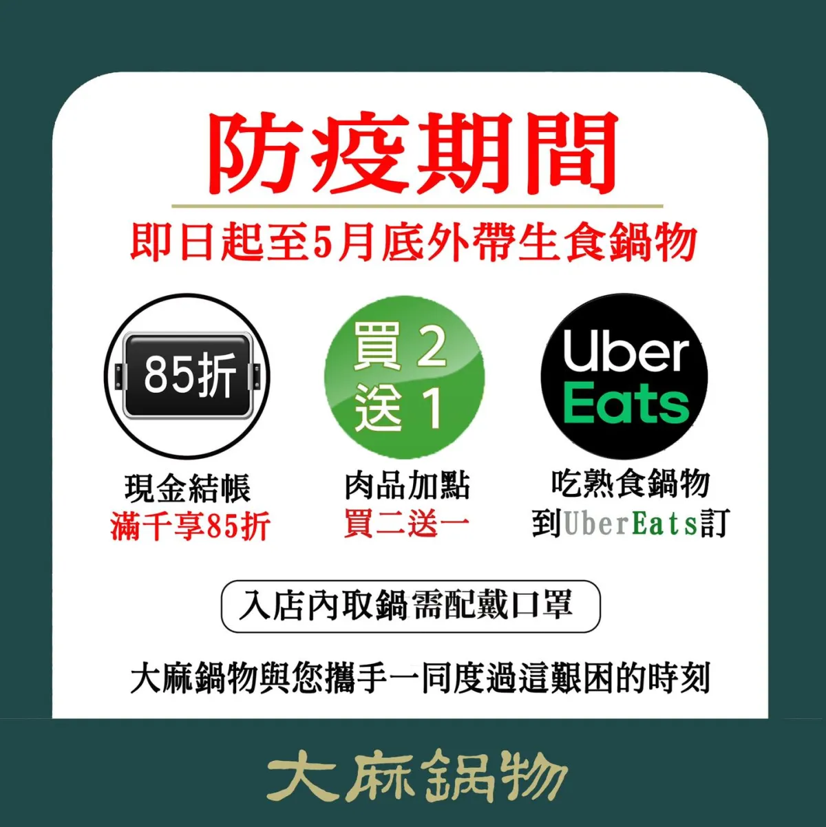 防疫期間請戴好口罩並保持社交距離,盡量減少外出,但是如果在家自己煮久了,想換換口味,在防疫期間,有許多店家都有祭出不少外帶優惠,凌雲在此整理了幾間桃園區火鍋業者的外帶優惠,各店家的實際優惠施行時間,請參考各店家官網或粉絲頁資訊,最後提醒,外出取餐注意安全與做好防疫措施,謝謝。