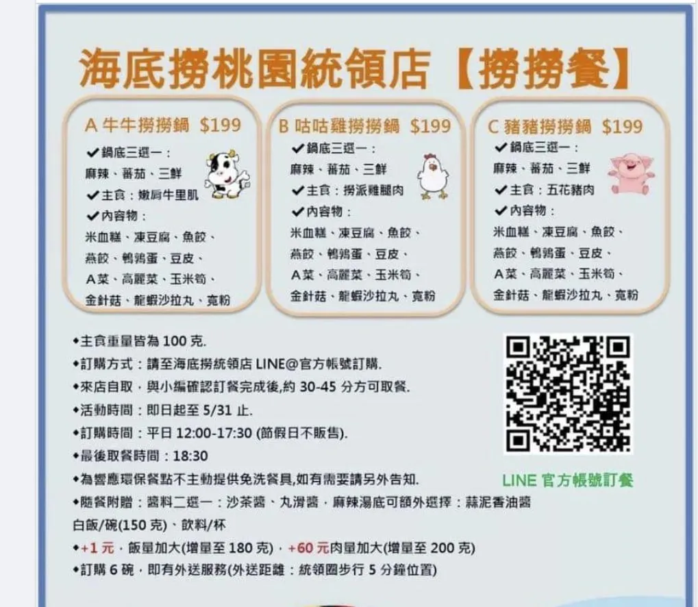 即日起至5月底,來海底撈火鍋 桃園統領店外帶撈撈餐,可享諸多優惠。