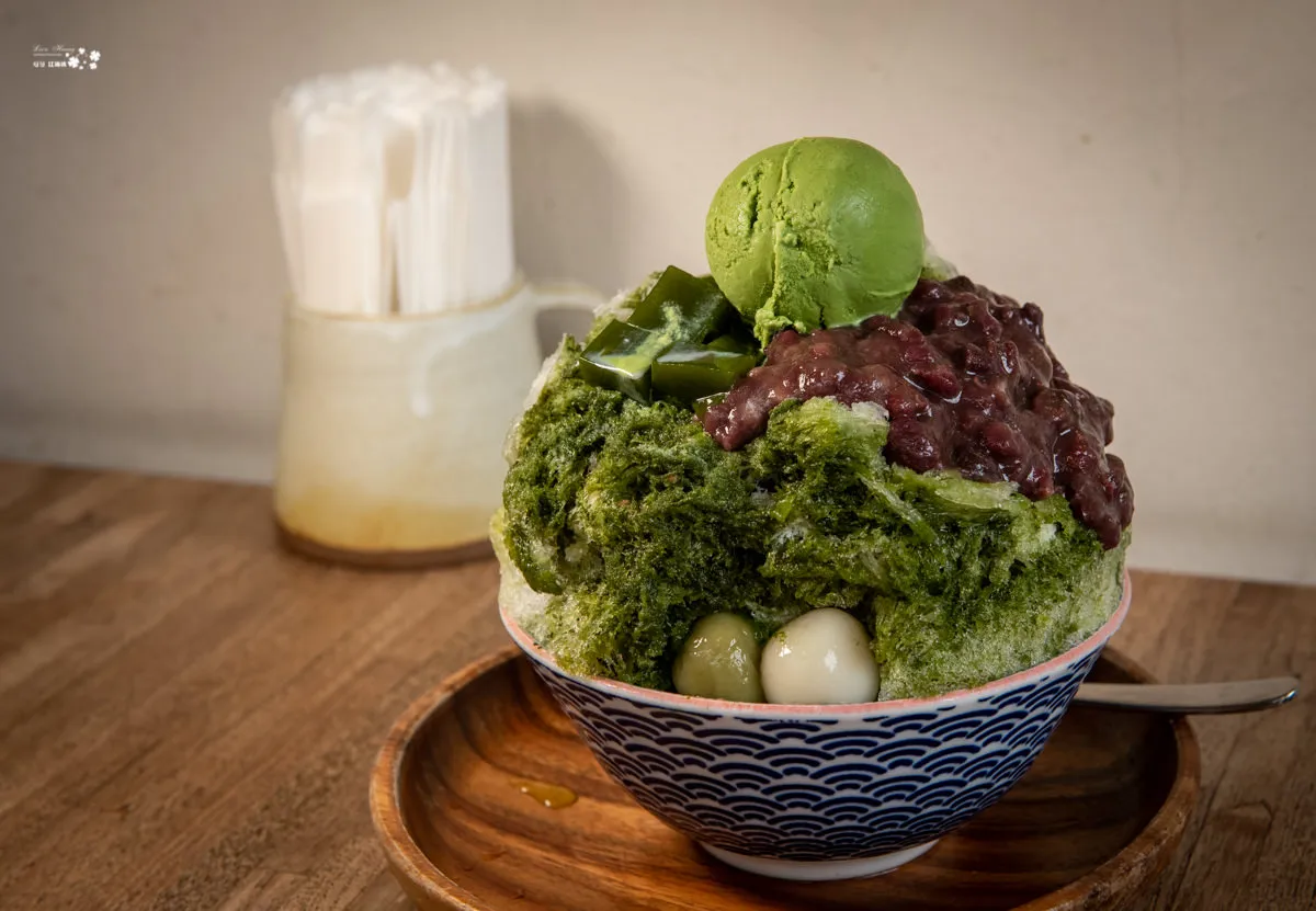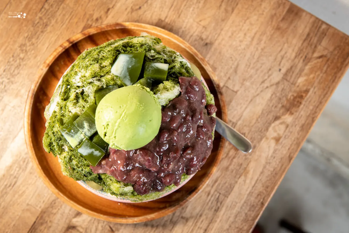 在刨冰裡塞入白玉,淋上抹茶糖漿與煉乳,撲滿紅豆與抹茶凍,最後放上一顆抹茶冰淇淋,濃郁的抹茶香氣與豐富的配料讓抹茶控女王超開心的。蓬鬆細膩的刨冰,入口化渣清涼消暑,抹茶糖漿與煉乳激起甜的漸層漣漪,抹茶凍帶來軟Q的微苦與甜膩的紅豆,碰撞出無比精彩的美味火花,帶有Q彈口感的抹茶冰淇淋讓濃郁抹茶味道更加醇厚,多層次的風味與口感,直教抹茶控的女王魂牽夢縈。