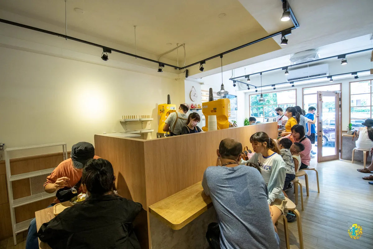 神木爺爺從店門外觀到用餐環境,皆採用簡約清爽的日式無印風格裝潢,以淺木色與暖白當作空間主色調,透過掛畫與招牌跳色來製造視覺亮點,整體呈現簡單又乾淨的舒適感受。在這樣的環境下吃雪花冰,愜意輕鬆。