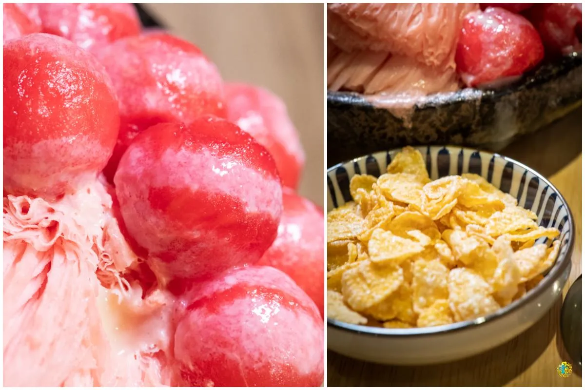 採用嚴選花蓮大西瓜,不加水打汁製成雪花冰磚,再將西瓜化成一球球可愛的丸子模樣,鮮粉的色澤撩動你的味蕾。綿密的雪花與沙脆的丸子帶來多層次的口感,不同程度的甜味讓人心動,夏天就該在爽快大口吃冰中度過。