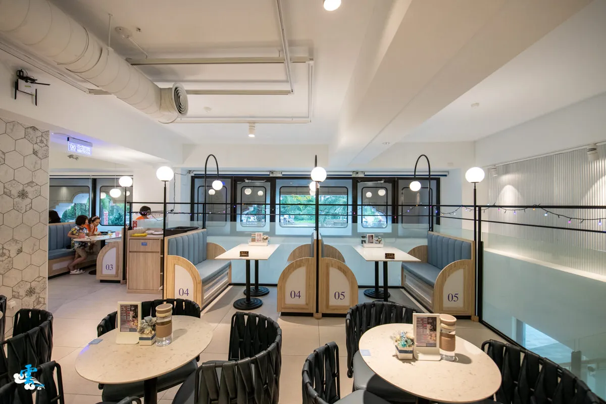 一樓採大面積的落地窗,加上前段挑高的設計,營造一個全景視野的俐落吸睛感受,也帶來充足的光線。室內裝潢以白色為基底,櫃檯後方則大膽的以綠色的磁磚,創造對比也凸顯了視覺的層次感,接著混搭大理石紋路的地板與牆面,打造如山水畫般的輕奢感受,透過幾何線條簡單的延伸與搭配,隨性的展現空間之美。