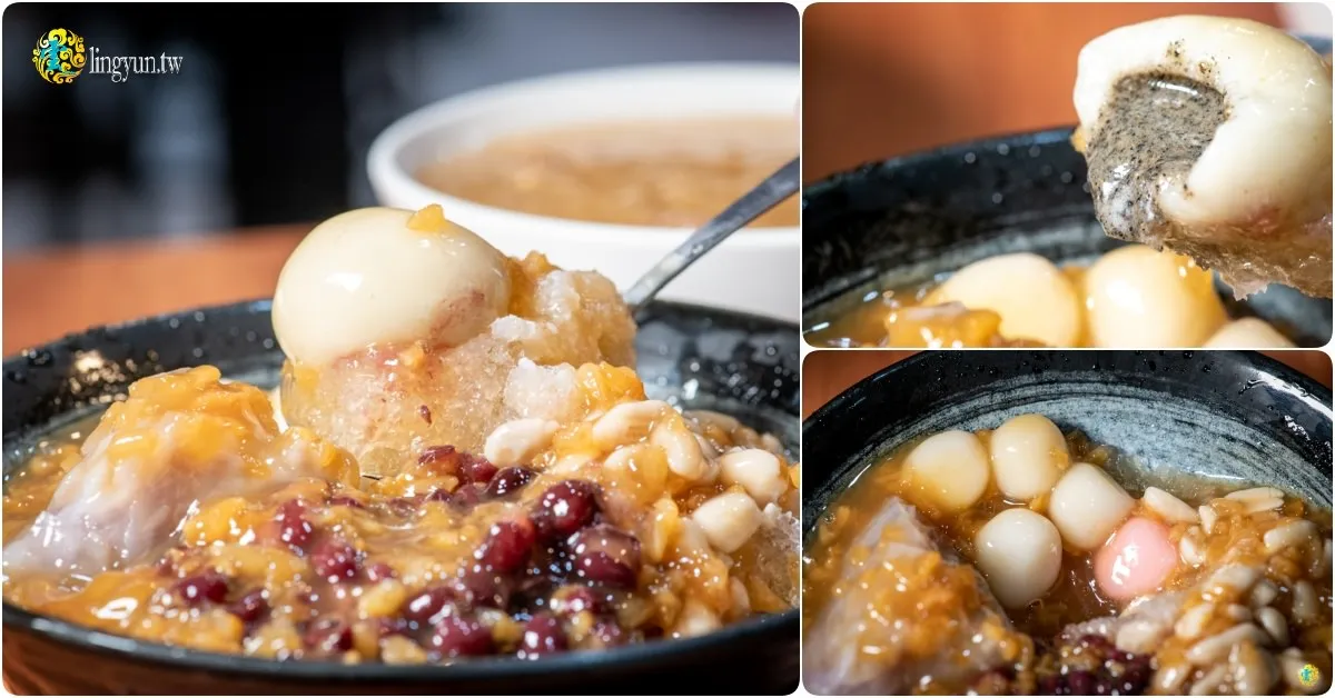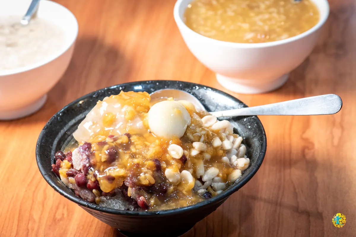 冷熱冰的配料很豐富,有大甲芋頭、花生、紅豆、小湯圓與芝麻湯圓,特別的是店家特製的糖水,是用綠豆仁與糯米下去炒的糖水,甜甜的有顆粒口感。店家煮的大甲芋頭,芋頭塊形狀完整,煮得很透,口感綿密軟濡,入口鬆軟甜度高,女王很喜歡。