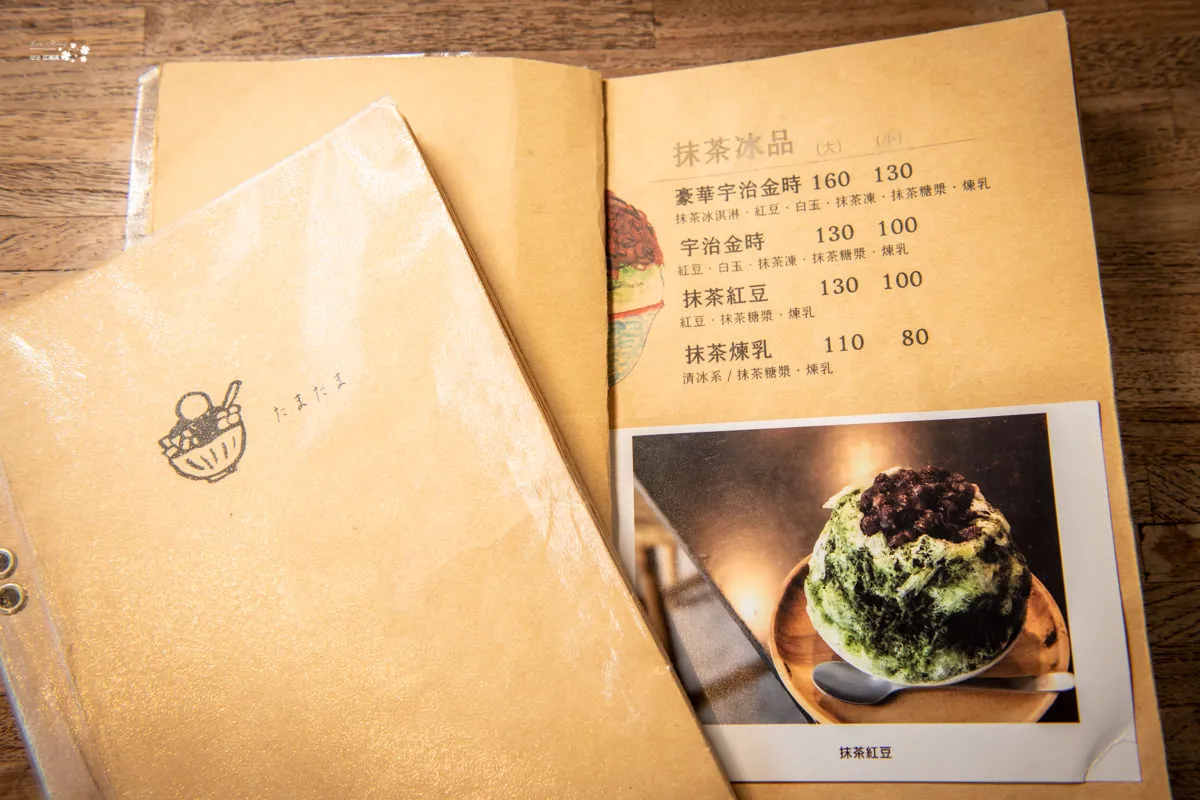 Tama Tama / たまたま 慢食堂菜單製作成像一本讀物,每一頁都只有一面有菜單,依據品項做分類,也有附上精美的圖片說明,內容會隨著季節做品項的變換,請以現場實際菜單為主。宇治金時與焙茶金時系列是店內人氣招牌,烤糰子與烤麻糬等也有不少擁護者,如果是草莓季節,草莓系列冰品也是熱銷商品。