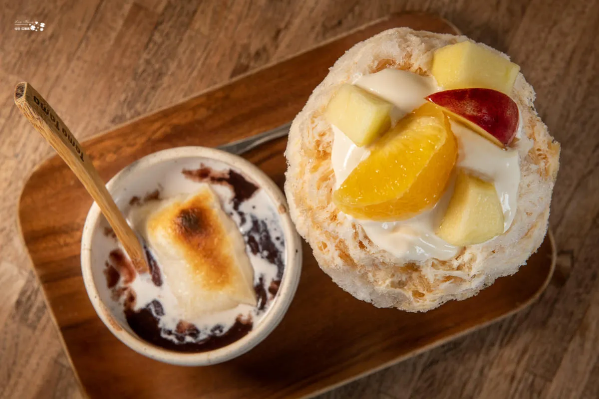 小小冰與甜湯組合,可以讓你自由組合,冰品可以8選1,女王選擇新鮮果物,甜湯則是3選1,女王選擇紅豆紫米粥、鮮奶再加烤麻糬。每天的新鮮果物略有不同,今天的是香甜的富士蘋果、脆甜可口的甜桃與果肉細緻的柑橘。果物都很甜,醃製的甜桃帶點酸味,與微甜微酸的蜂蜜優格交疊下,多層次的風味迷人。 底下是比較細的刨冰,雖不似雪花綿綿冰那種細綿,也是另一種美味。