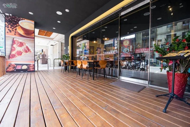 門口走廊鋪設木質地板,涼爽的天氣在戶外享用Pizza,一定很棒