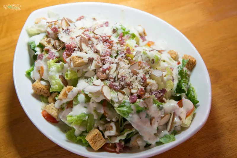 新鮮番茄,羅曼美生菜,杏仁片,培根,法式麵包丁,帕馬森起司,雞肉,凱薩醬