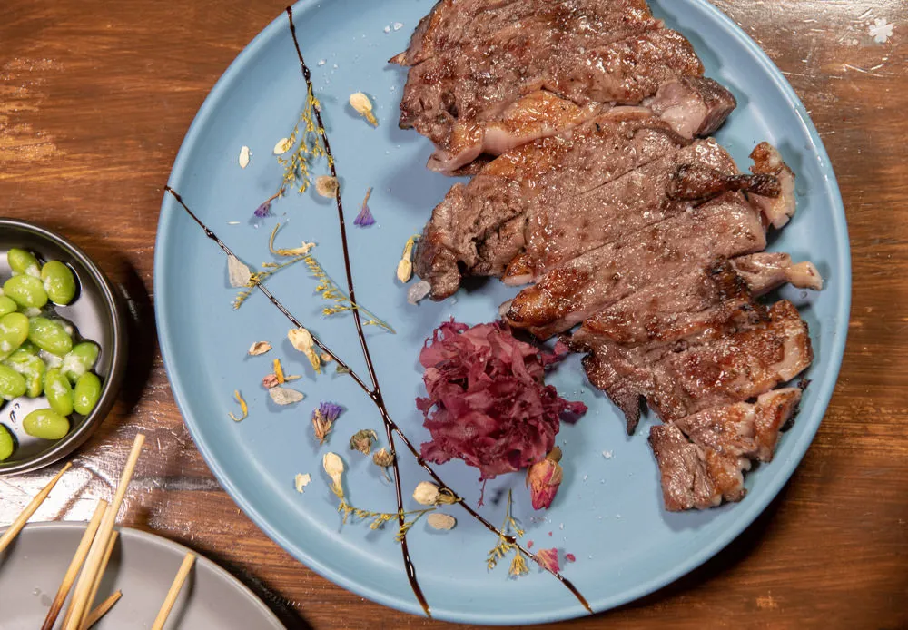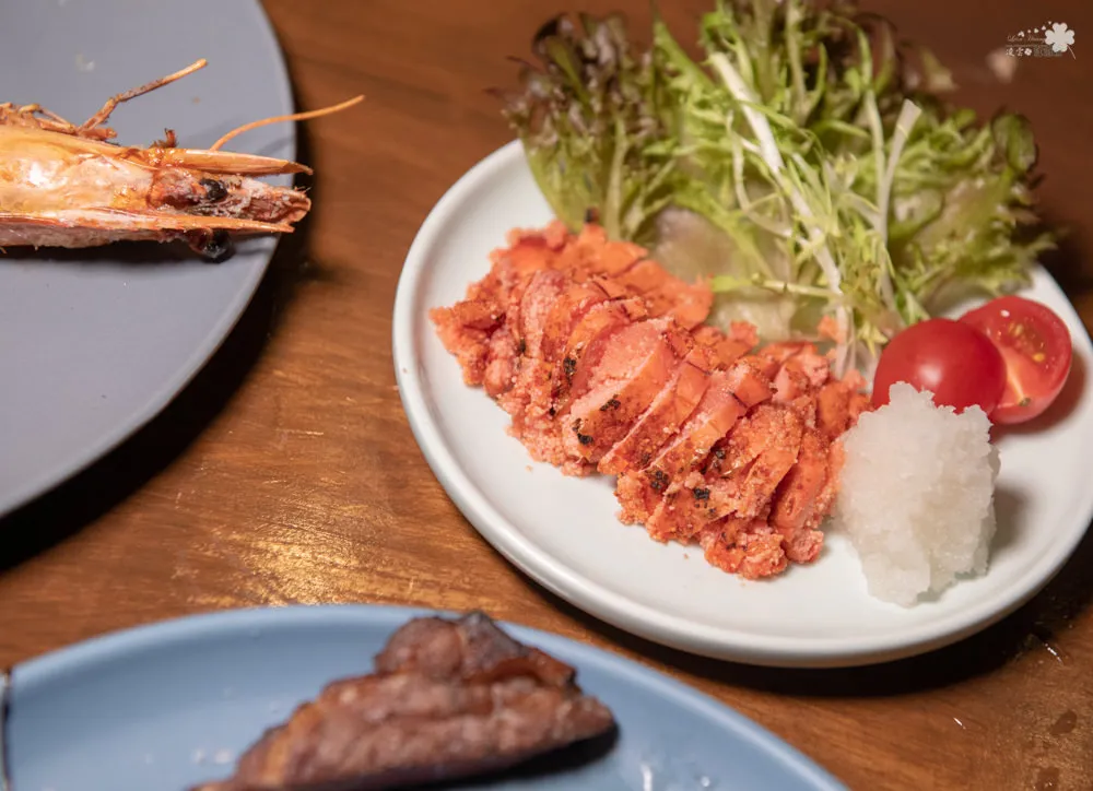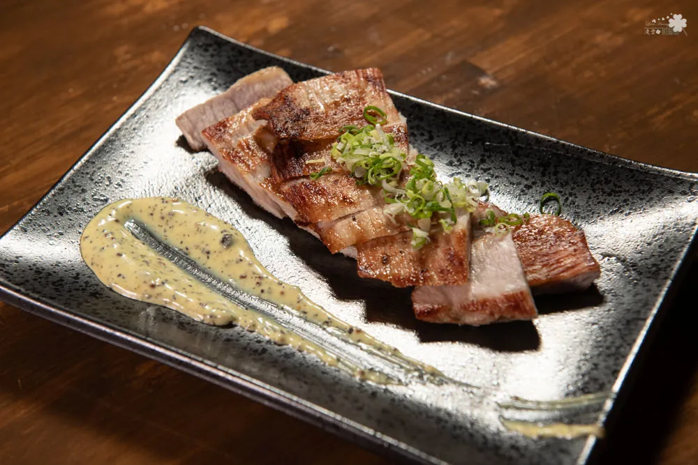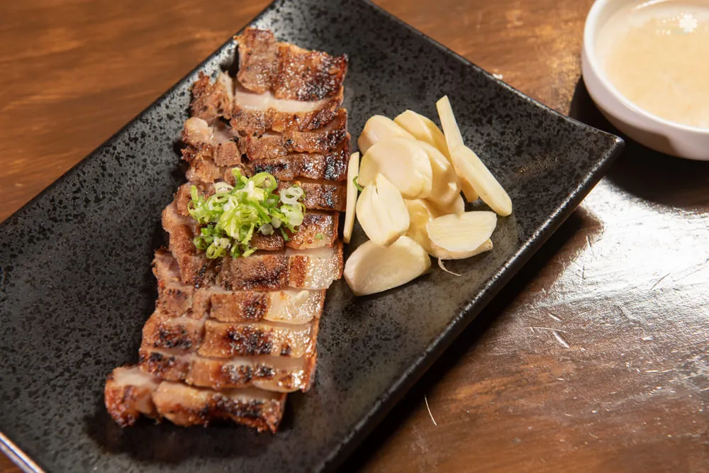 全程炭火燒烤搭配柒日精心調配的醃料,鹹香酥脆,搭著蒜片一起吃,盈滿口中的蒜香與肉香,軟嫩不乾澀,一點點的辣味增加了味道的厚度,超稱職的下酒良伴。