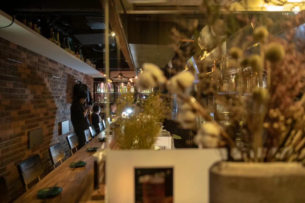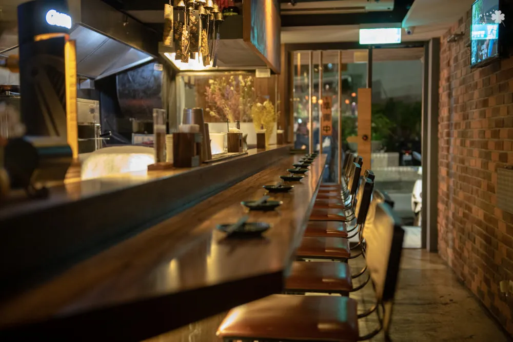 狹長型的用餐空間,裝潢設計相當有質感,除了吧台的位置之外,最裡面還有一張長桌可容納較多顧客。雖然串燒是特色賣點之一,但是在這裡一點也感受不到油煙味,取而代之的是有質感的文青風。開放式的廚房,可以看到即將料理的食材與師傅們專注認真的神情,如果沒有三兩三哪敢將手藝獻給顧客看啊。另外仔細觀察一下左邊牆面中間有塊鐵板,如果把他打開就是一張靠牆的桌子了,馬上變成【立食區】,當有重大運動賽事的時候,店內空間就可得到充分的利用。牆面上還有水管造型的架子,可掛衣物或隨身包包。