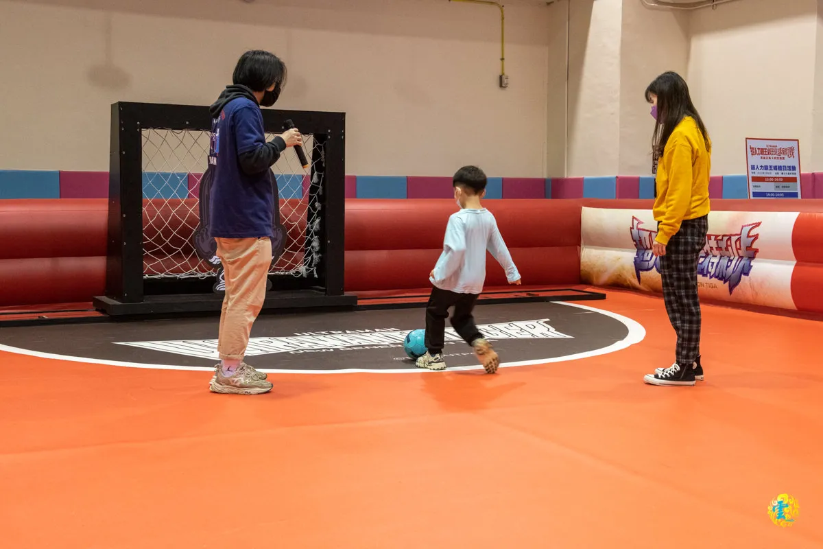 由於是親子2人體驗賽組,一開始會有專門的足球教練簡略的說明,如何踢球、帶球、擋球等基本動作,並讓孩子實際操作演練,教練很專業也很有耐心的帶著孩子完成每一項動作。場地的規劃成長17米寬6米的全場空間,沒有守門員,取而代之的帶有怪獸圖案的移動式球門,增添了不少樂趣。