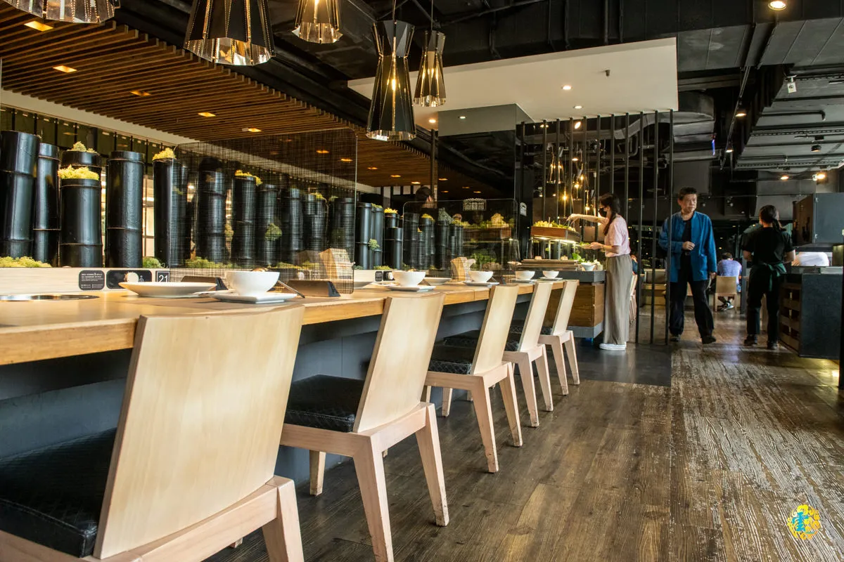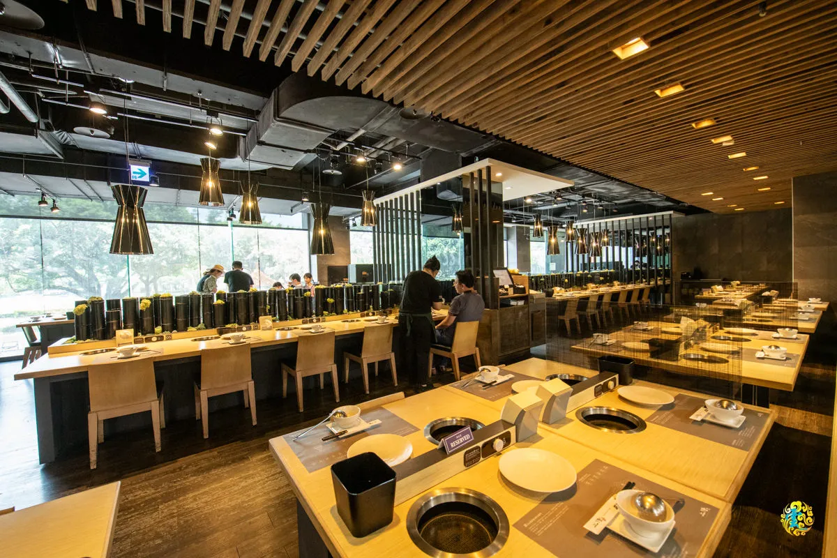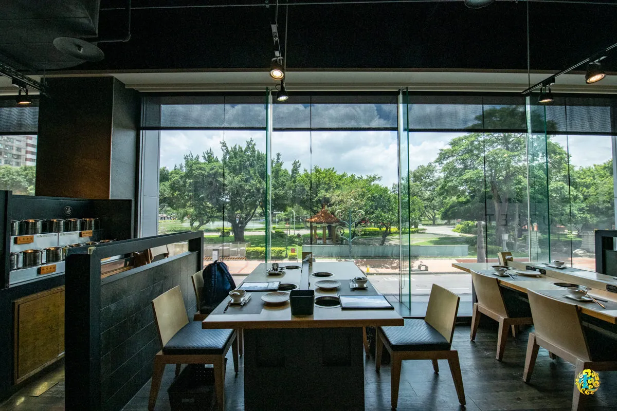 上澄鍋物的裝潢設計以小京都風格為主,營造出寧靜和雅致的用餐氛圍。大面積落地窗設計不僅可以一覽台中公園的美麗樹景,提供自然的用餐背景,也帶來了明亮的採光,讓整個空間充滿生氣和活力。天花板上鐵件外露的設計展現了粗獷的輕工業風格,帶給餐廳一份獨特的質感,木質的鋪陳和簡單的線條則營造出空間的層次感和沉靜氛圍。這種質樸的內斂風格搭配著溫暖的色調和投射燈光,讓整個用餐環境顯得溫馨而優雅。