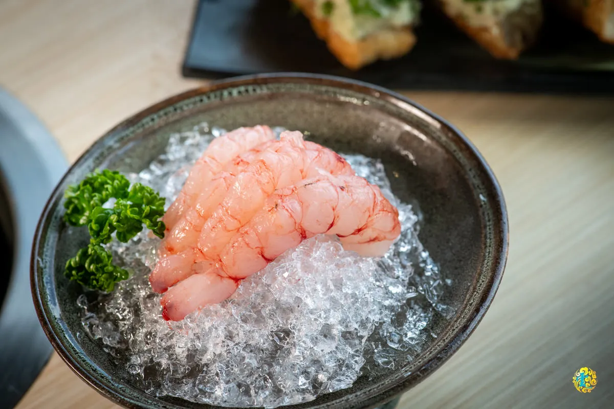 通常只能在高級日本料理店的握壽司中才能品嚐到的胭脂蝦,在上澄鍋物也能吃得到說,這份餐點的供應相當有限,因為胭脂蝦的捕撈難度極高,所以只能不定期地供應給幸運的客人。今天凌雲非常幸運,能夠品嚐到這樣一道美食。為了確保胭脂蝦的新鮮度,在捕撈後立即進行急速冷凍保鮮,以便在下鍋前保持最佳的口感和風味。胭脂蝦是一種深海蝦,生活在深度400米的海底。長期處於深海高壓的環境下成長,造就了極為細緻輕盈的肉質,口感宛如絲綢般柔軟,每一口都充滿著鮮美的海洋風味和舌尖上的柔軟感,難怪被譽為蝦界的和牛。