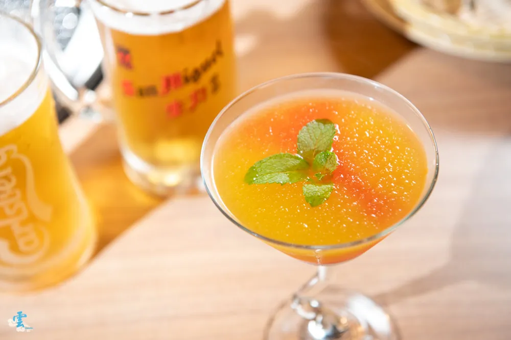 燒肉殿板橋店目前提供8種調酒喝到飽,今晚的這杯調酒因為是新研發的,尚未取名。選用蘋果、柳橙、梅酒去作調和,上方有薄荷葉作點綴,喝起來超像柳橙冰沙,香氣馥郁且甜度高的濃縮果汁,帶著淡薄的酒味,清爽又適飲,女孩子會愛的調酒風味。