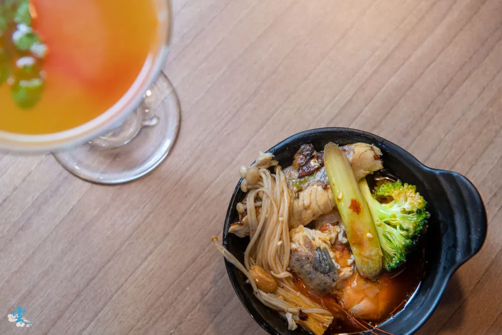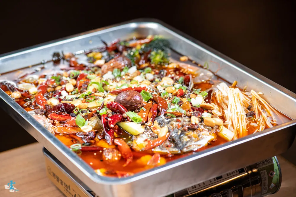$499與$699需要加價$99即可享用美味烤魚,$899以上則是直接贈送一盤烤魚,不過每桌只送一次。烤魚源自重慶的正宗渝菜,選用一整隻的七星鱸魚,配上鮮蝦再灑上大量的各式大辣椒與花椒、洋蔥、蒜頭、丁香、小茴香、白豆蔻、金針菇與肉桂等多種新鮮香料熬煮的湯底。甫一上桌,各式辣椒與花椒的麻辣香氣在空中飄散,吃一口馬上麻整嘴,潑辣的紅油恣情奔放,給你帶勁又有層次的味蕾之旅,七星鱸魚細嫩的肉質加上沒有土味,在香麻帶勁的豐厚味道中,依然能品嚐到他厚實的鮮味,嗜辣的朋友一定超愛的。