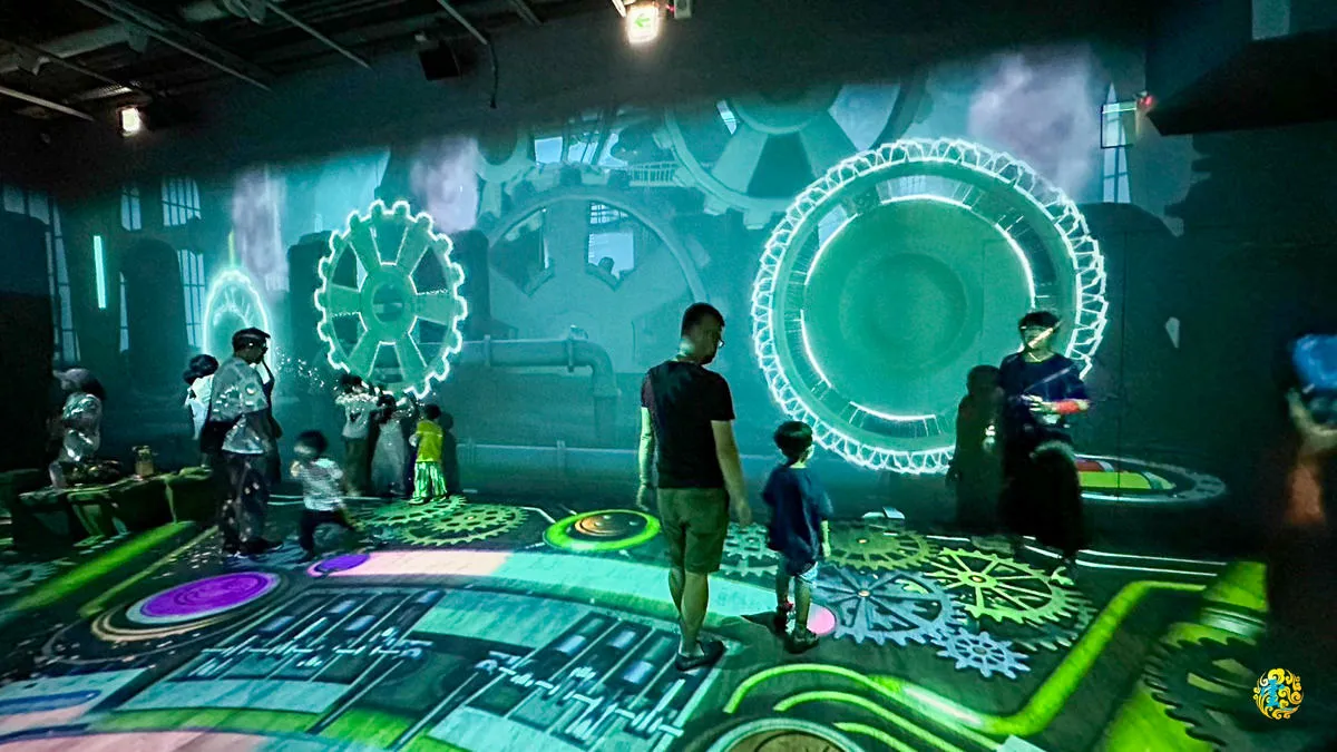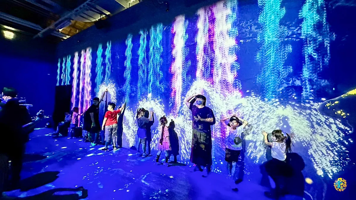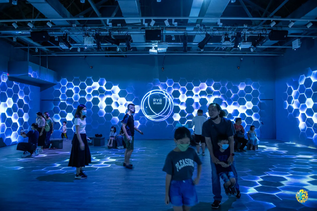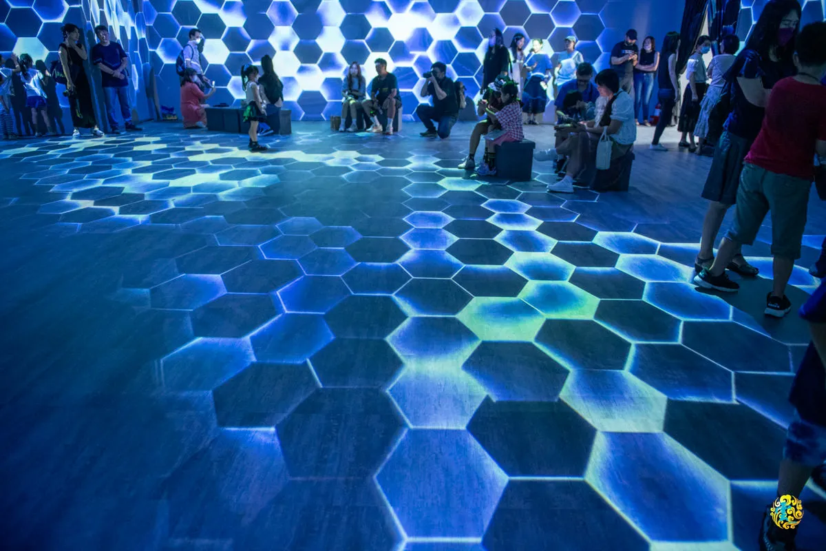 一進入展間,彷彿踏入了未來的奇幻空間!四周圍的牆面、地面都像蜂巢一樣,充斥著令人嘆為觀止的科技感投影效果。還沒有來得及張口,現場的小朋友們已經像充滿了魔法的彈簧一樣,跳來跳去、開心得不知所措!連大人們也不甘示弱,跟著小朋友一起探索,好像回到了童年時光,尋找著藏在展覽角落的奇妙驚喜。