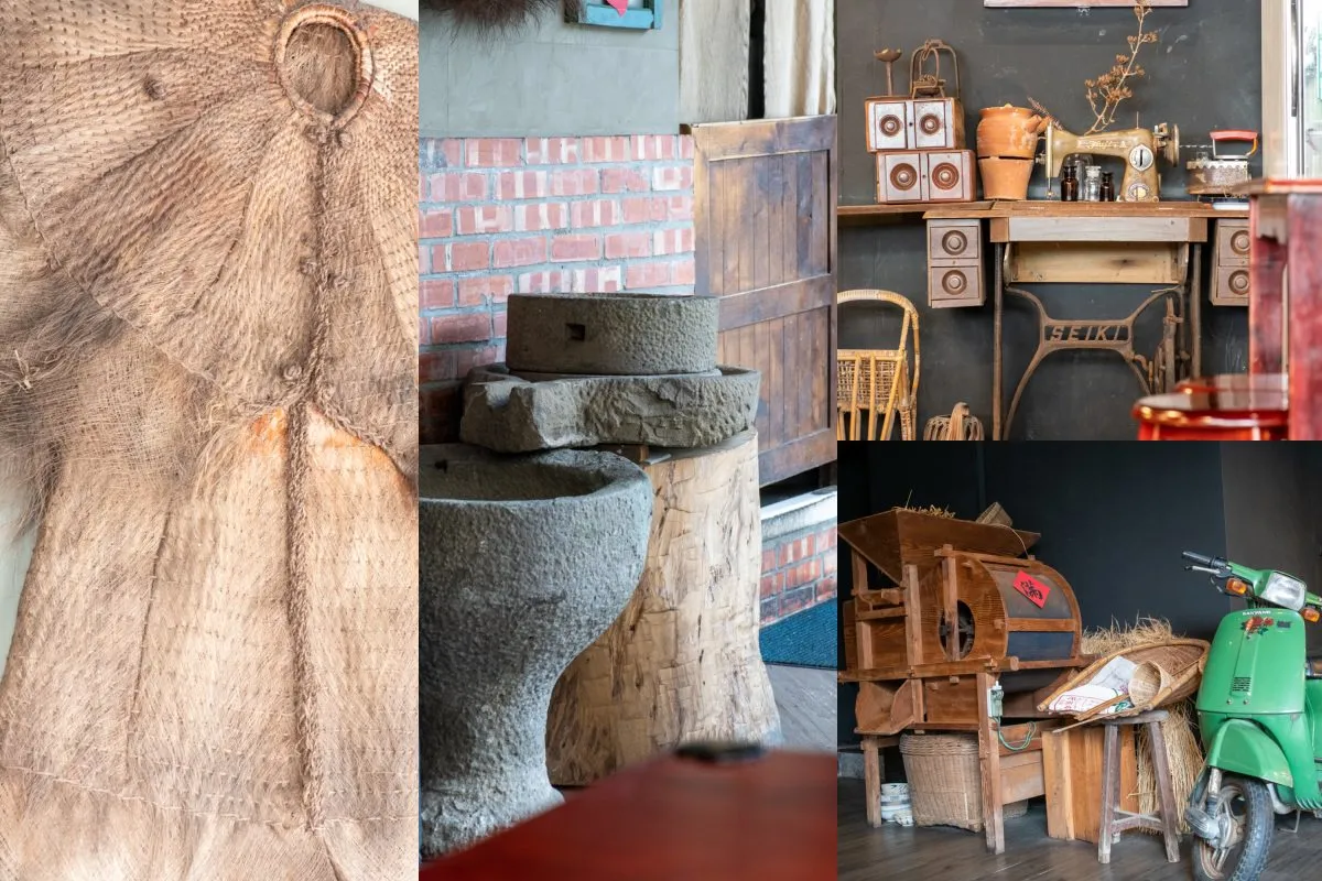 辛梅以粗獷的輕工業風為室內空間設計主軸,混搭永不退風潮的台式復古風格裝潢,透過粗胚天花板上裸露的管線、灰漿塗刷的牆面與斑駁的紅磚牆,妝點輕工業風獨特的冷冽氣息,透過紅色系的溫暖木質桌椅,緩和了空間中偏冷的視覺感受。在牆上、角落等處擺設稻穀去殼裝置、斗笠和蓑衣等復古元素,增添視覺亮點也呼應古早味主題。