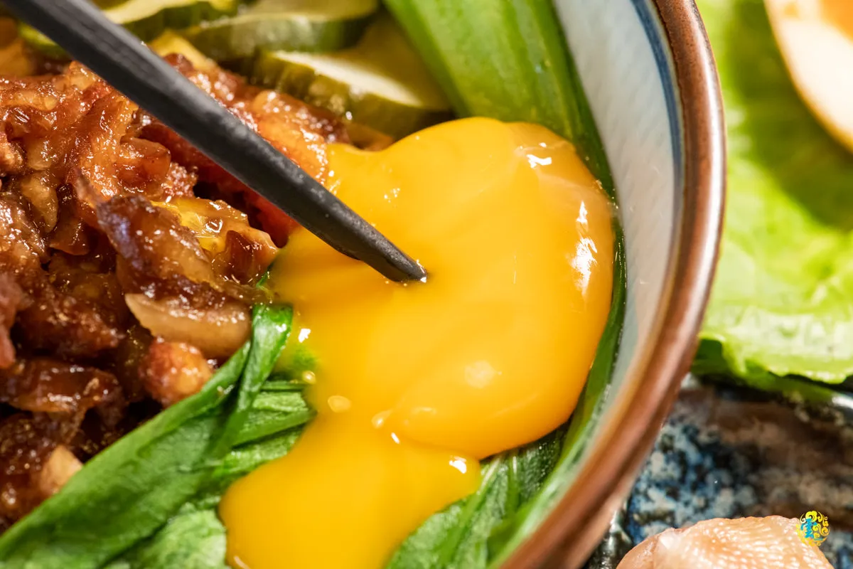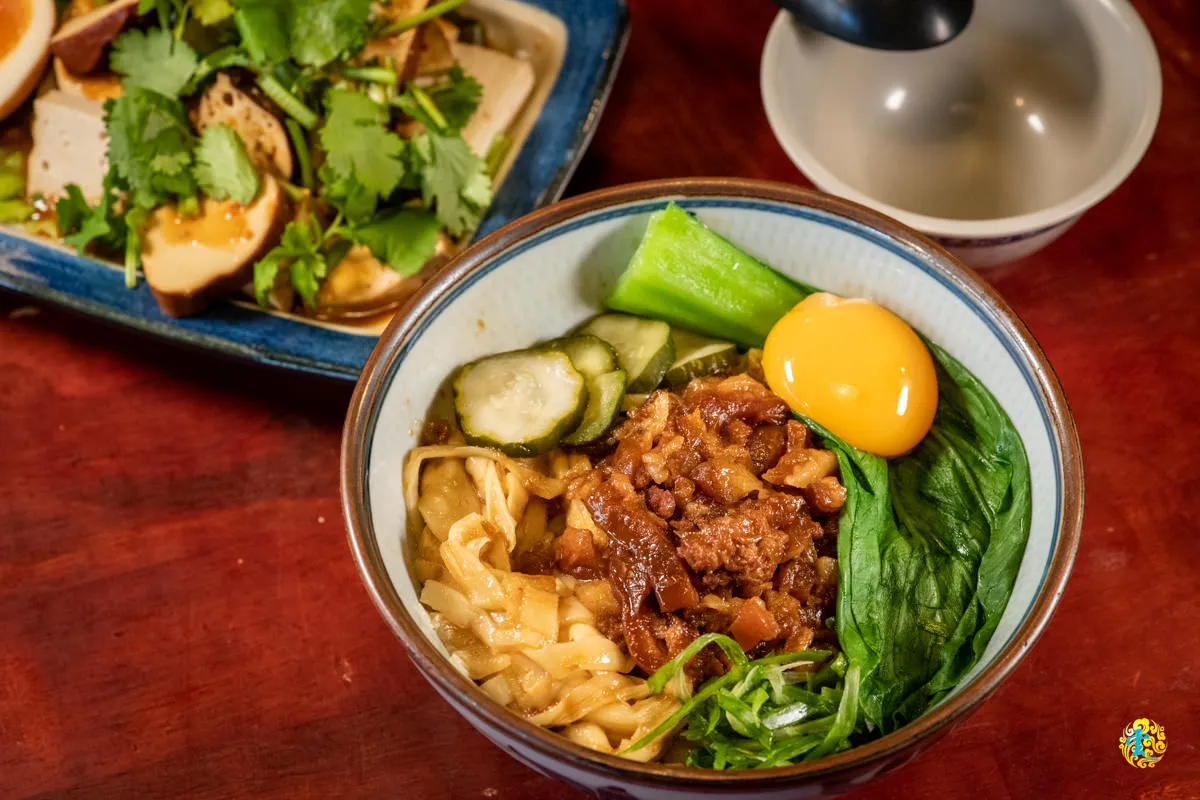 滑嫩飄香的肉燥滿滿的鋪在黃油麵上,青江菜與小黃瓜讓視覺多了點色彩變化,存在感十足的陽光蛋黃不止吸睛,還扮演著相當重要的角色。將所有食材充分攪拌後,食材的各種滋味在嘴裡慢慢釋出,味道豐厚卻又清爽的大快人心,有一定彈性和嚼勁的麵條充分吸收滷汁的香味,吃起來鮮香味美,蛋黃的軟滑口感、滷汁的鹹香味道和青菜的爽脆口感相輔相成,豐富了口感層次,黃澄澄的蛋液讓肉燥更加香嫩可口,也濕潤了乾麵,青菜平衡了滷汁的鹹度,洗煉又精緻的層次,為舌尖增添一番不同凡響的難忘滋味。