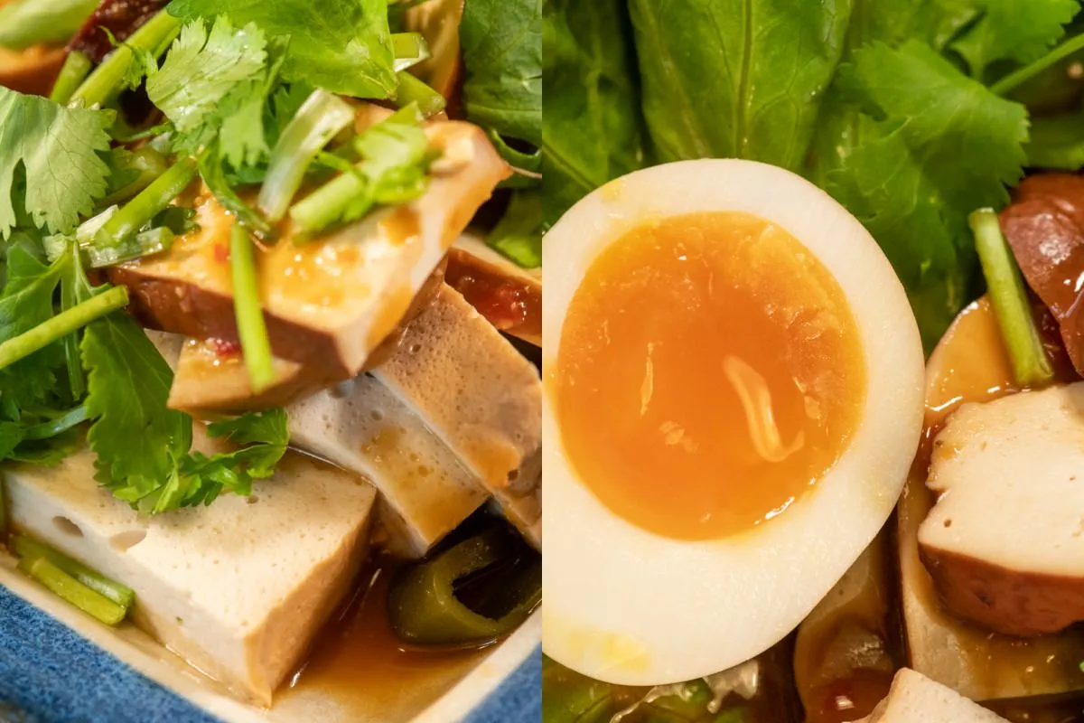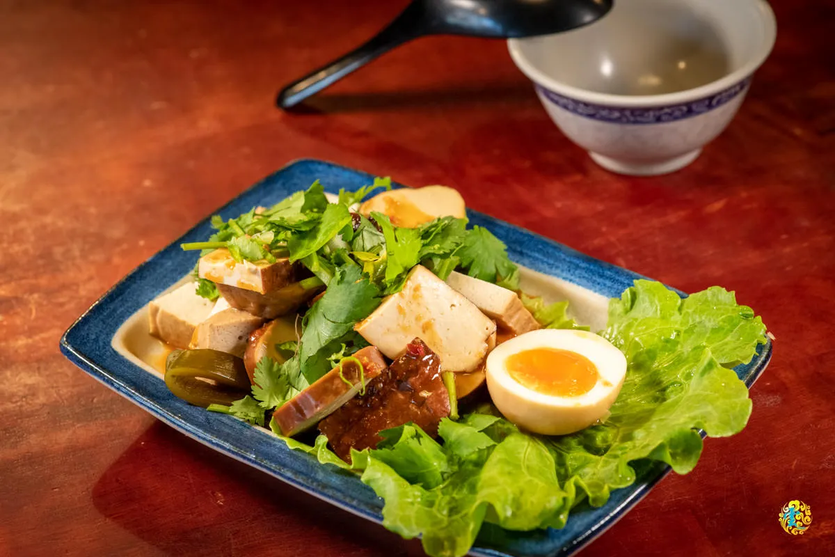 滷味拼盤是一道非常下飯的小吃,醬料固定帶點微辣,可以選擇不要香菜,內容物有大豆乾、小豆干、素雞、素肚、百頁與海帶等隨機搭配,滷味拼盤的口感豐富多樣,不同的食材和滷汁醬料相互融合,讓整道菜肴的口感更加豐富、層次感更加鮮明。