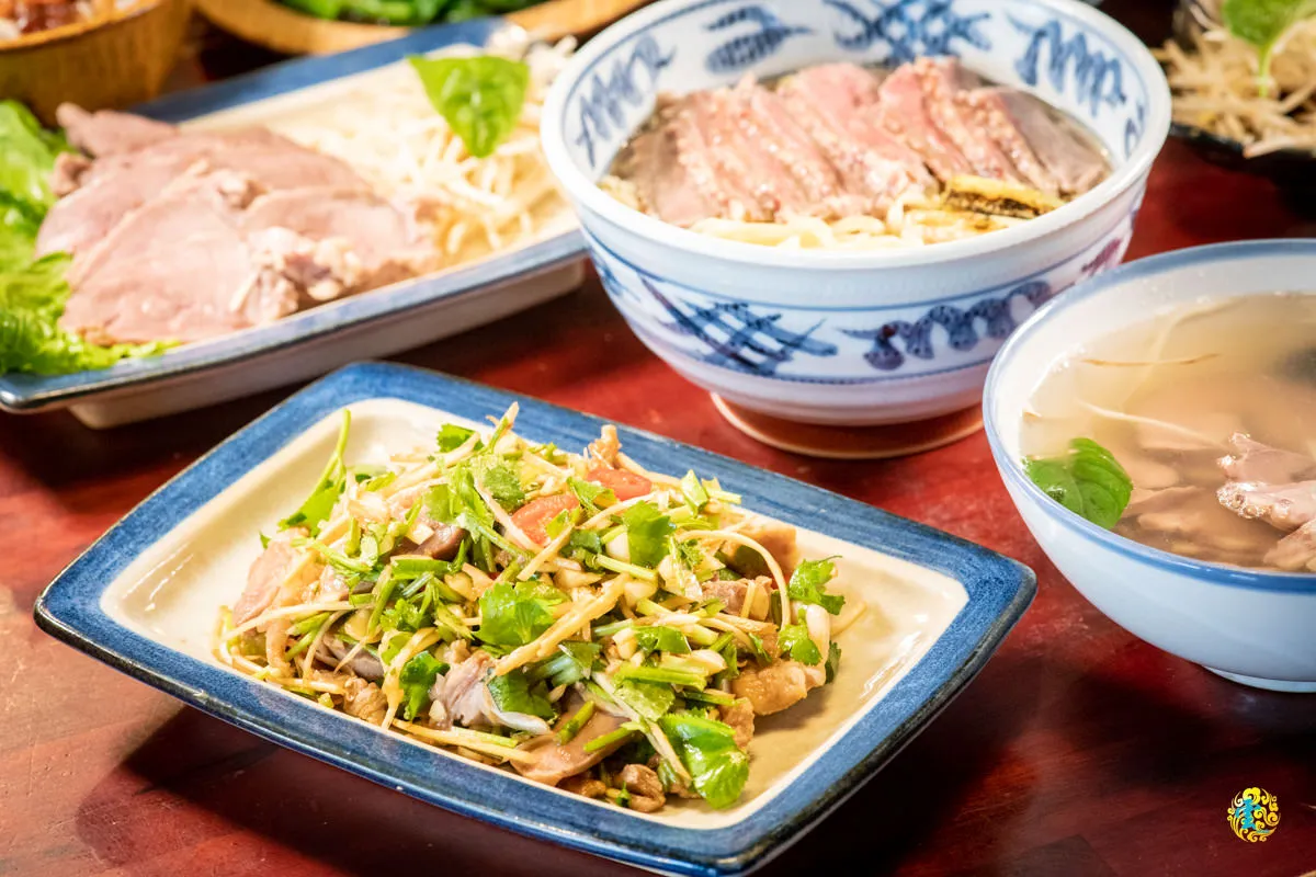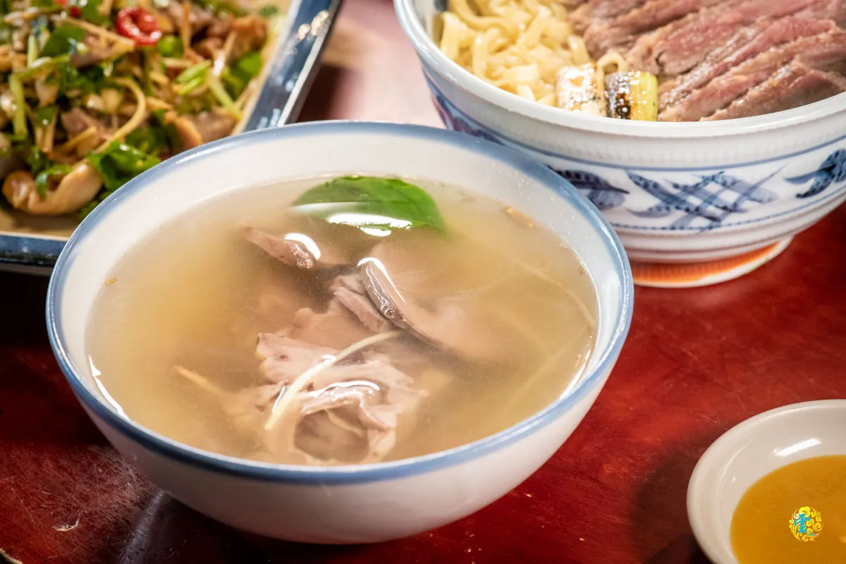 細緻滑嫩的黃色意麵,口感比起一般的麵條更具有彈性,吃起來帶有嚼勁,且能夠很好地吸收湯汁的風味。脂肪分布比較均勻的鴨肉,肉質較為細嫩且肉汁十分豐富,湯頭的濃郁味道,能夠將鴨肉的鮮美風味與麵條的口感完美結合,加入辛梅特製的辣醬調味,能進一步的提升整體風味。