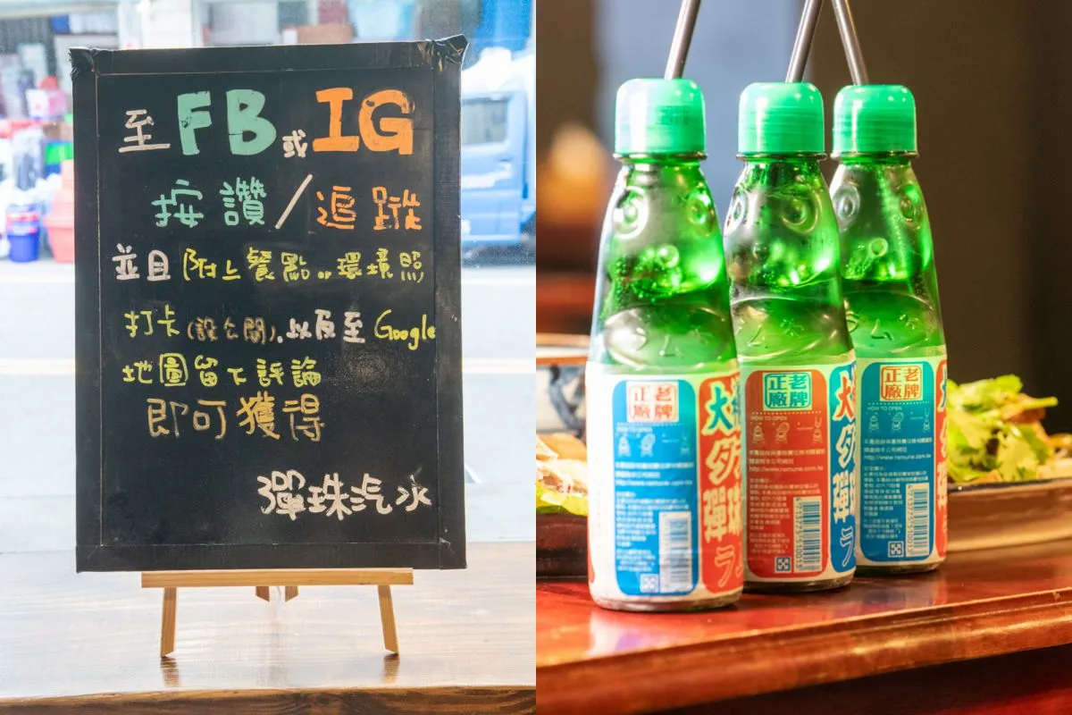 辛梅目前推出打卡送彈珠汽水活動,只要在FB或IG按讚或追蹤,並且附上餐點或環境照片打卡,並至Google地圖留下評論,即可獲得彈珠汽水。