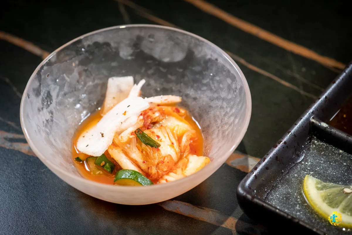 這是餐前小菜,在韓式泡菜上再置入紫蘇醃蘿蔔與辣味小黃瓜,然後全部都浸泡在韓式泡菜的醬料中,滋味酸爽,增加食欲。