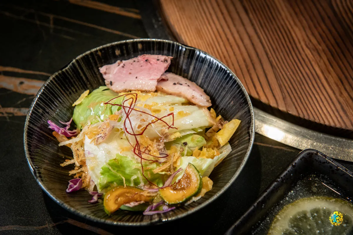 幾片舒肥鴨肉拌著芋頭片、地瓜片與生菜,再淋上和風醬。生鮮蔬菜的清甜被略帶微酸微鹹的和風醬輕輕托起,將粉嫩的鴨肉帶入厚實飽滿的滋味。