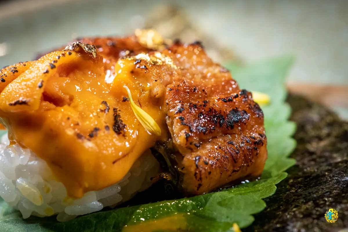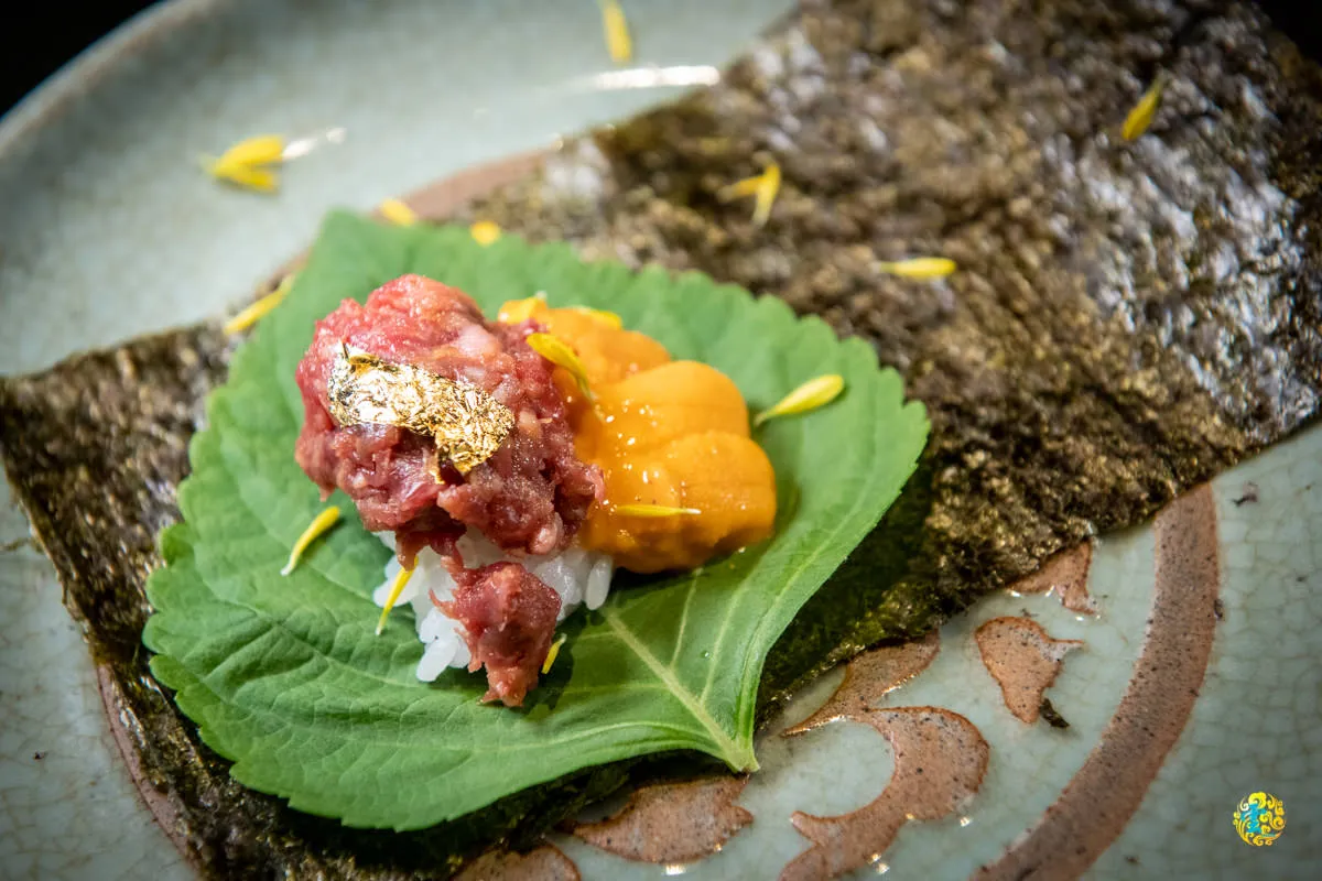 在生牛肉上放片金箔,增加視覺效果,嫩度適中的生牛肉,帶Q勁又多汁,迷人的甜味與香氣盈滿口腔,海膽那獨特的味道帶著鮮甜,讓牛肉更濕潤滑順,適度的減輕油膩感,,也凸顯了牛肉豐厚的口感,生菜與海苔增添口感的層次。
