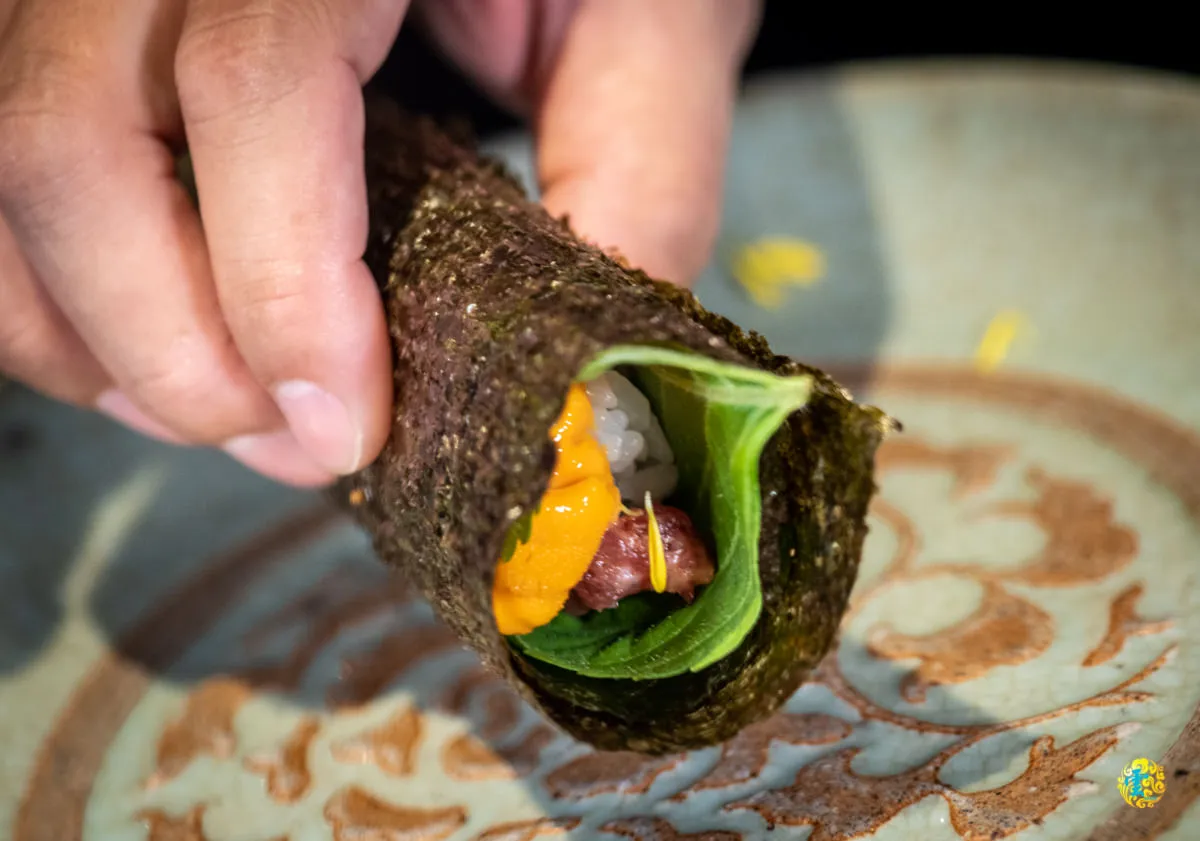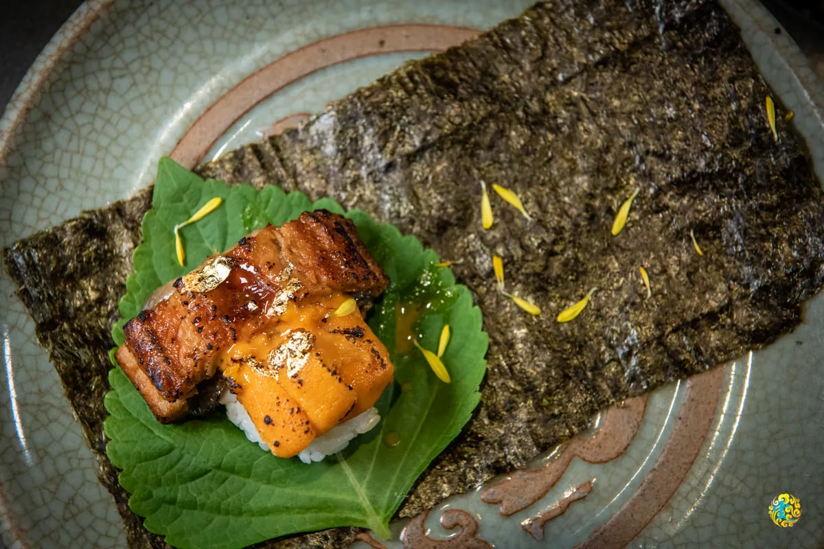 山上走走為不吃牛的顧客提供鰻魚海膽手捲,同樣透過金箔點綴視覺亮點,去骨後的鰻魚塗上店家特調的醬汁,在精準的火侯掌控後,鋪在醋飯上面,搭配炭火燒烤後的海膽,入口鹹香柔嫩,香中帶鮮,鮮中帶嫩,厚實又肥美,尾韻帶點輕巧甘甜。