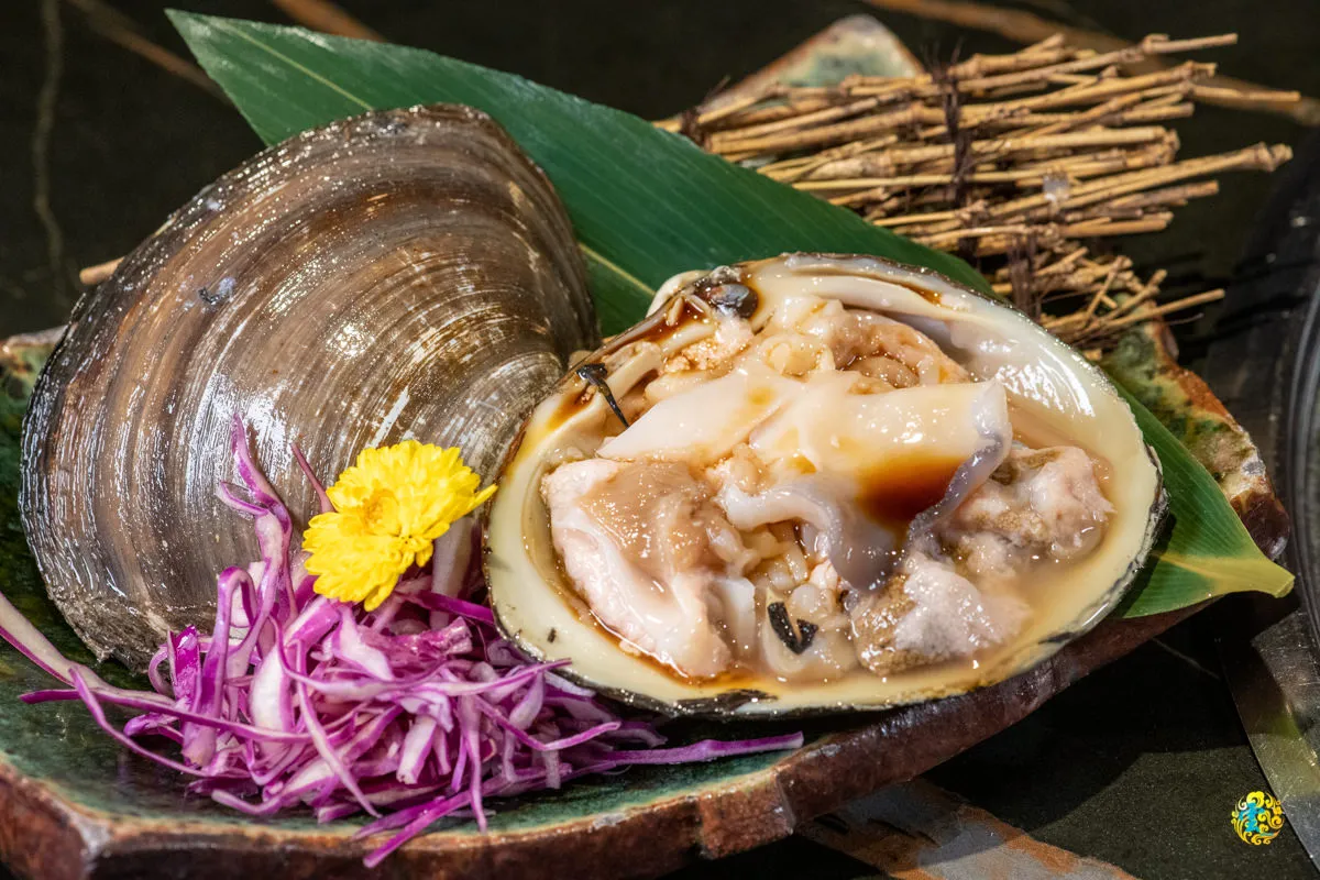 這是凌雲額外單點的活體北寄貝,可以直接生食,如果不敢生食或者味道不習慣的話,也可以透過燒烤來熟食,等於是生食火烤兩吃。生食在落喉時會飄出淡淡的腥味,可以沾點檸檬汁或水果醬去除那一點點的腥味,生食有肥嫩嚼勁還帶點脆度,類似花枝的咬勁但是沒那種黏稠與難咬的感受。烤完後的熟食降低了海味也更微軟濡。