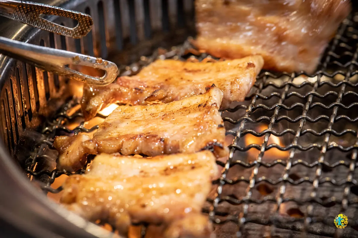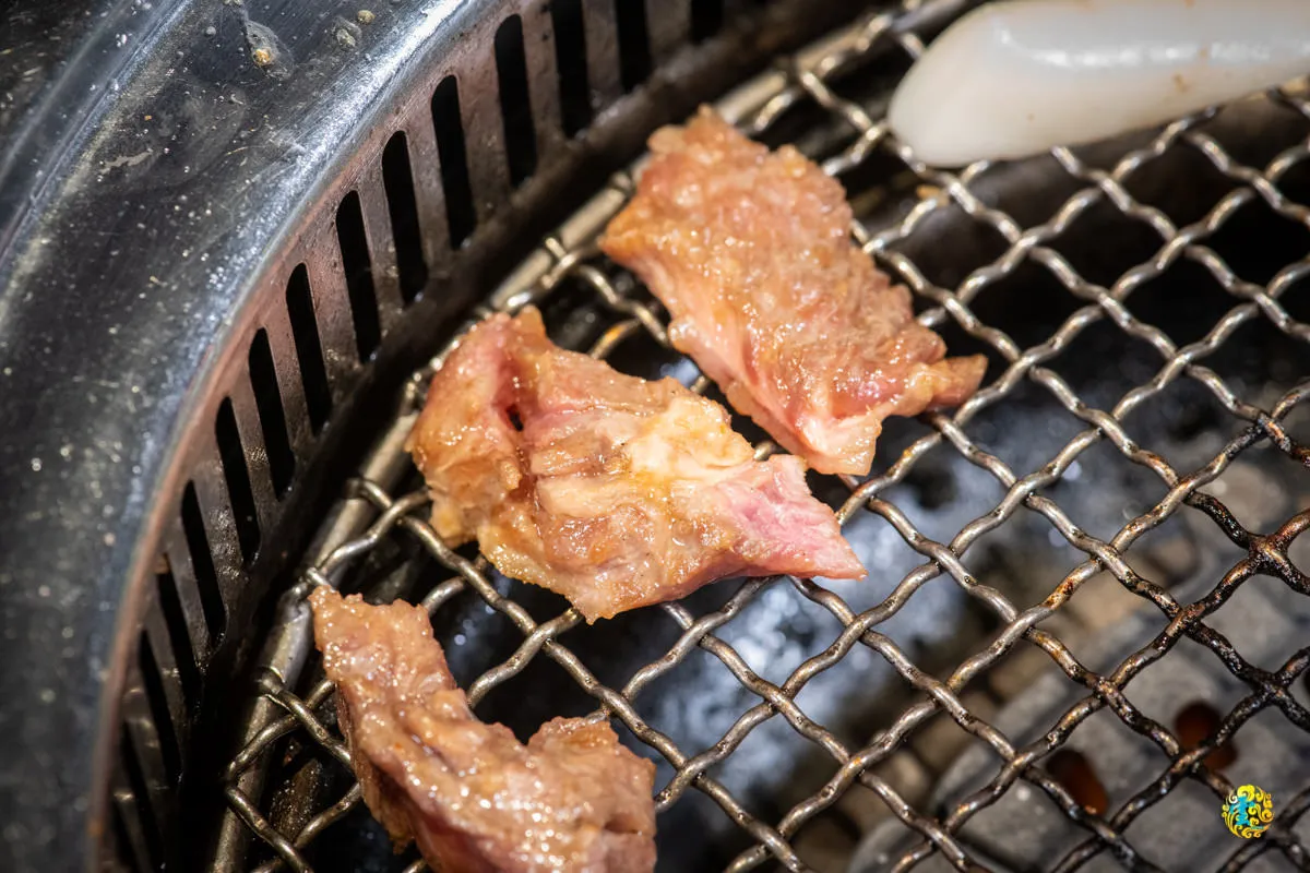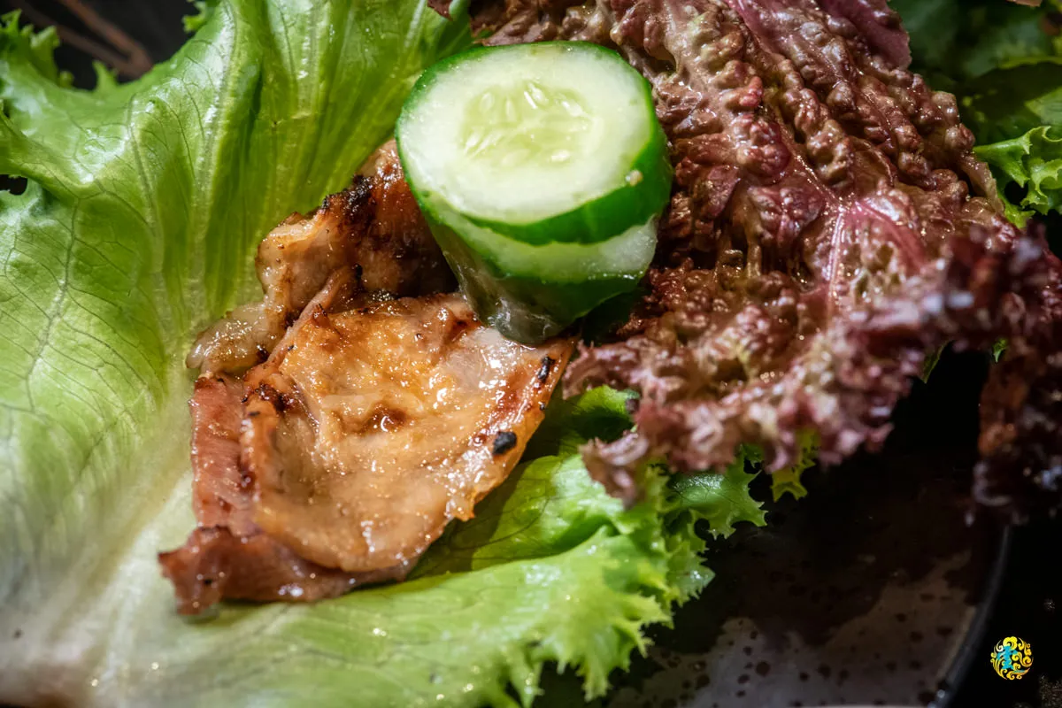 油脂偏少帶咬勁的豬背肩,燒烤後吃起來順口而不膩,搭配隨附的菜盤食用,感覺就像在吃韓式料理一般,有蔬菜的脆度增加口感層次。