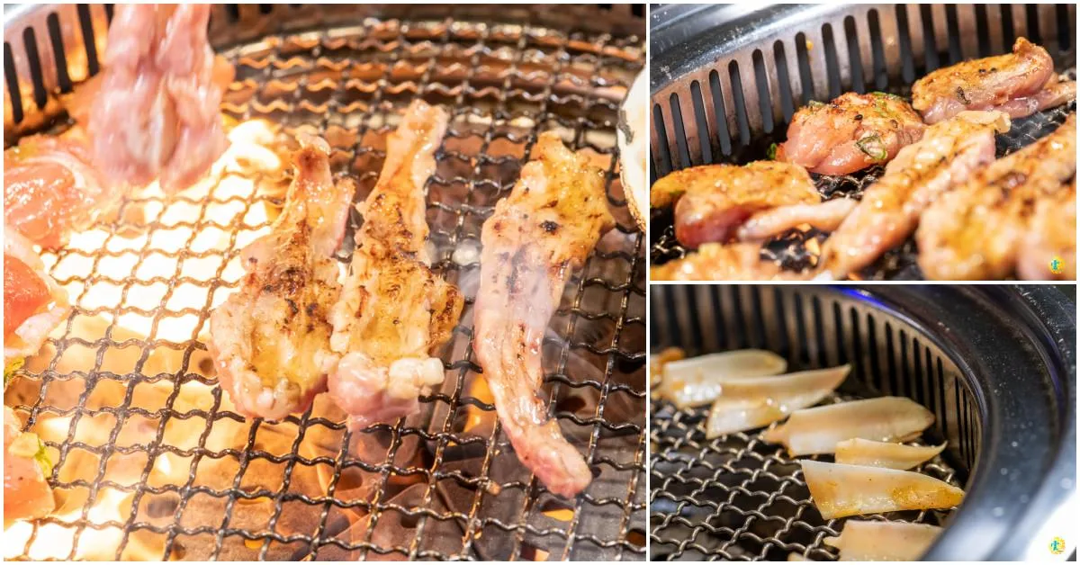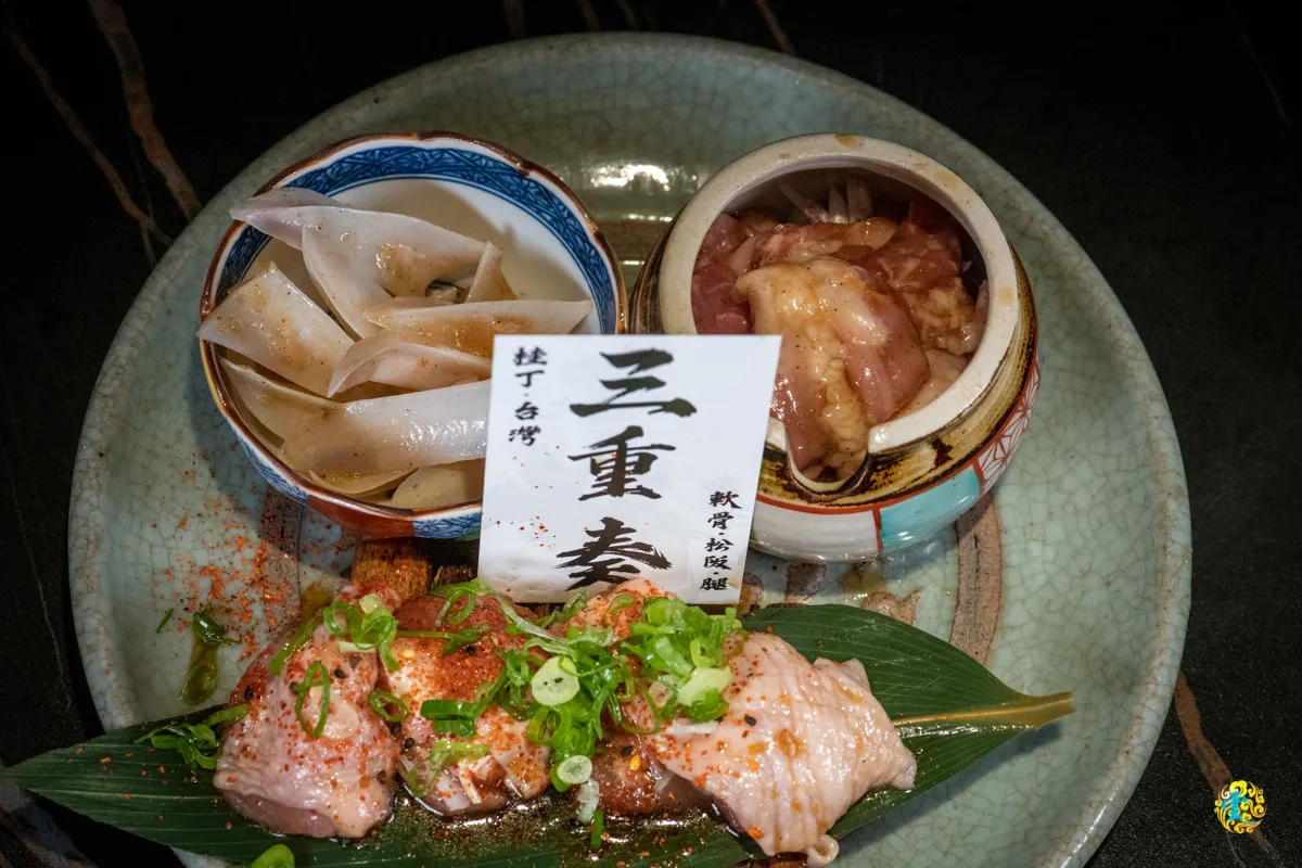 桂丁雞三重奏包含雞腿肉、雞軟骨與雞頸肉。雞腿肉與雞軟骨建議放置在烤網外圍,雞頸肉則是建議放置爐子的正中間燒烤。油嫩的雞腿肉,帶嚼勁的雞軟骨,以及有脆度又Q彈的雞頸肉,一次提供三種不同口感的風味。
